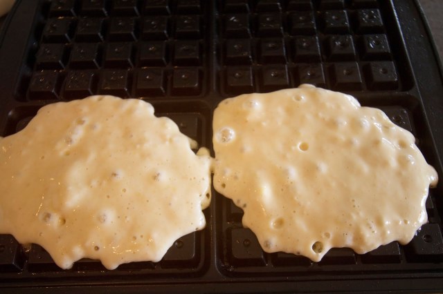 Paint your hot and ready waffle iron liberally with olive oil so you can get a crispy waffle that doesn’t stick. Pour 1/3 cup scoops onto your waffle iron. I use a 4 square iron, and 1/3 cup for each waffle works perfectly.