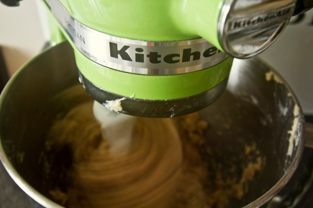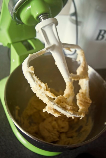 Cream the butter and sugars together in the mixer. If you don’t have one, a wooden spoon will work too, but I hope you’ve been workin’ out!
