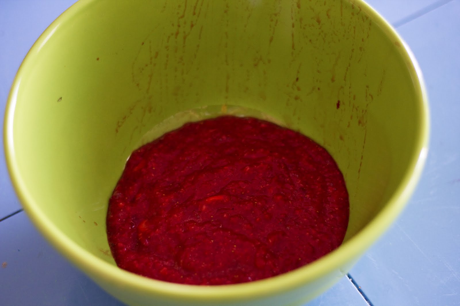 Once you have a smooth puree, pour the strawberries into a large mixing bowl…