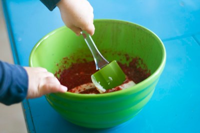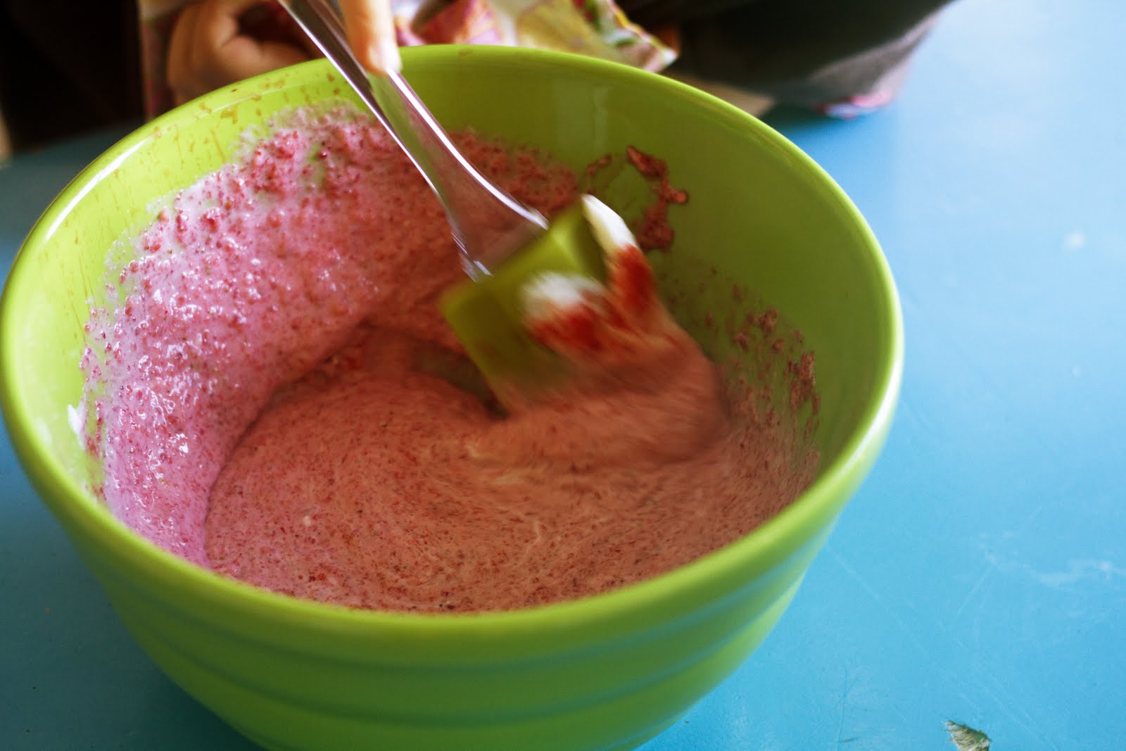 …until it’s all mixed up into a pretty pink colour.