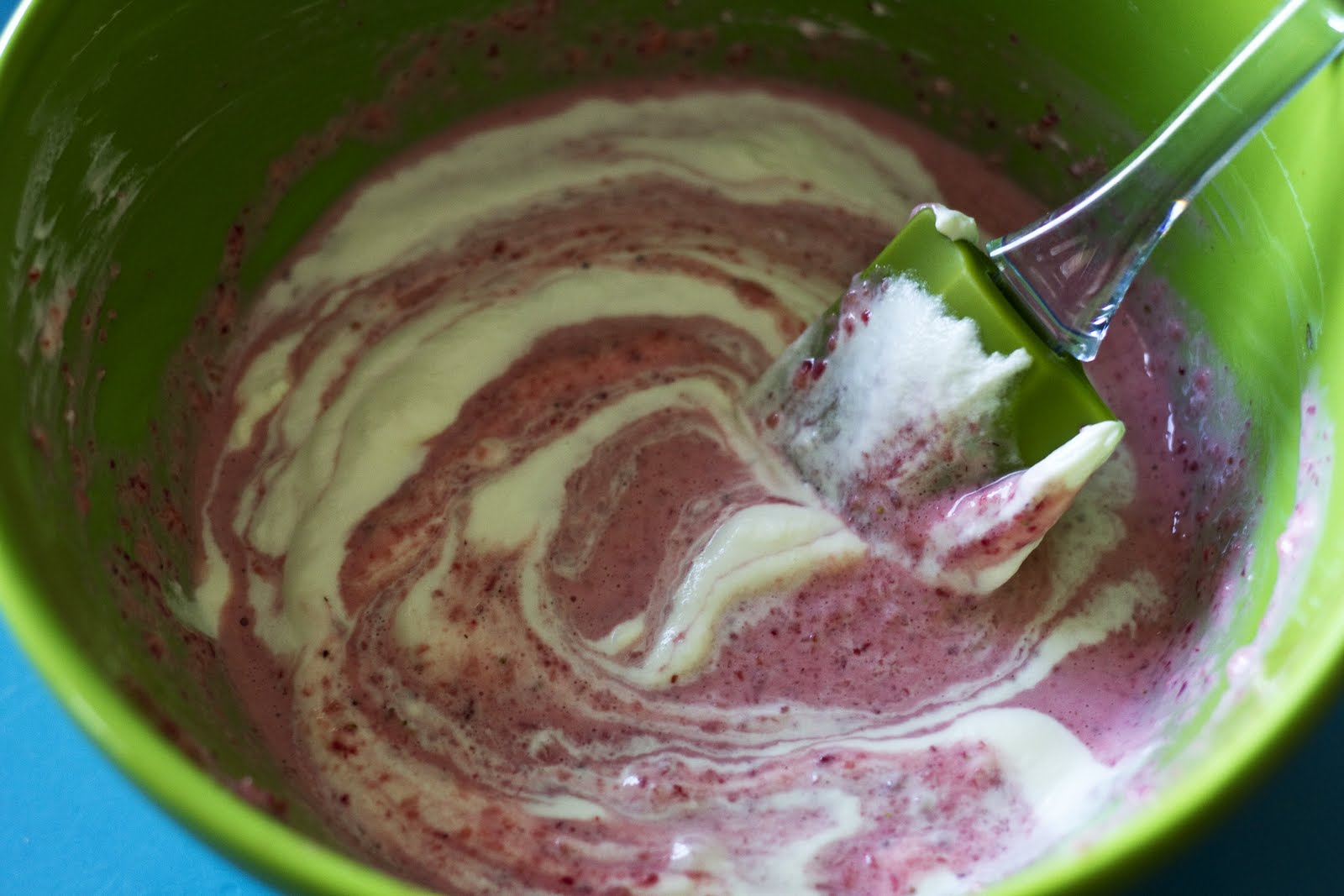 Do not overmix on this stage or you won’t have a swirly popsicle.  Just a few stirs will do.