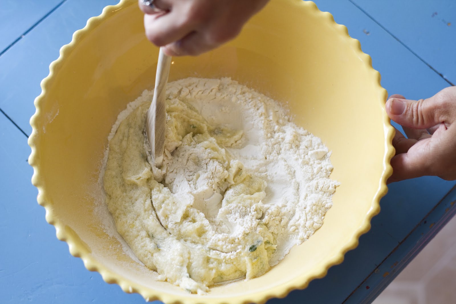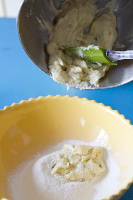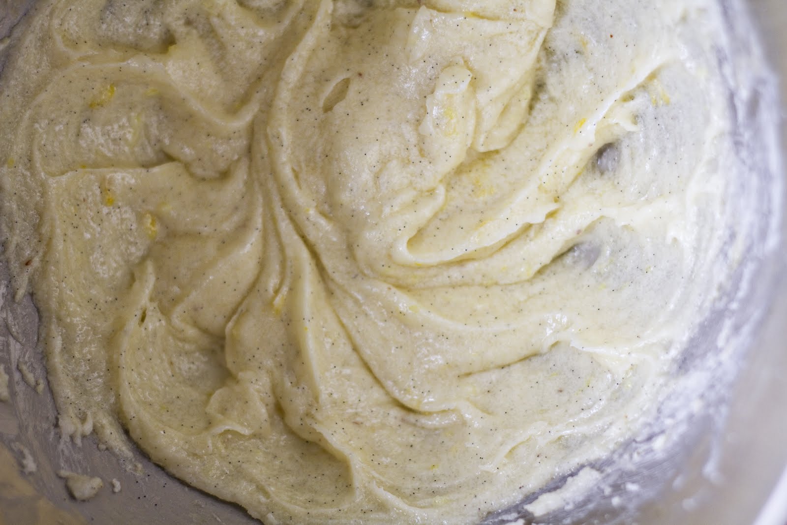 Finely chop 2 tsp of lemon thyme leaves and add to creamed butter, sugar, eggs, zest, and vanilla.