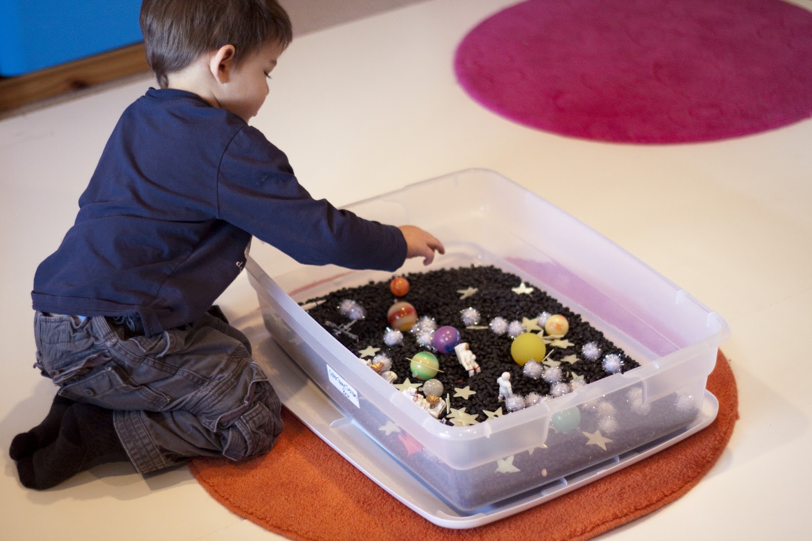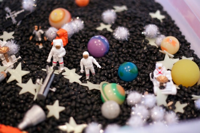 This one was very simple and quick. We used four bags of black beans, 2 bags of glow in the dark stars from the dollar store, a couple bags of sparkly pompoms for “meteors”, a tube of plastic planets from ToysR’Us, and a yellow bouncy ball for the sun. Then we added a tube of astronauts and satellites, rockets, moon buggies, and space shuttles.