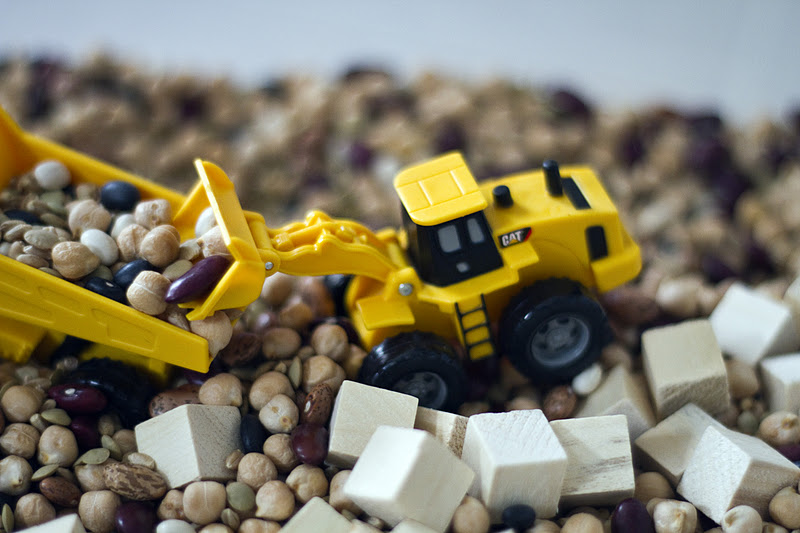 We bought an $8 set of mini CAT machines at ToysR’Us and the hauling and scraping, filling and dumping began!