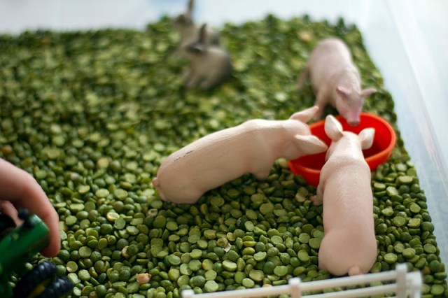We chose split peas for the substrate and then filled it in with all kinds of plastic farm animals. And what farm is complete without tractors? A trip to Peavey Mart had us all stocked up in al colours and styles. We even found a little plough attachment. We added a little stable, some fences, wheel barrows, buckets, hay bales, plastic veggies, and animal brushes.
