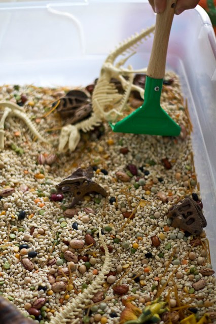 We added a few “live” dinosaurs to further extend the play possibilities of this bin. The boys especially love the “carnage” this box lends itself to! Hehehehehe! The beans become the eggs and then the egg stealers steal the eggs, and then the cranky mumma comes along…and well…this is NOT a quiet world in a box! That’s for sure!