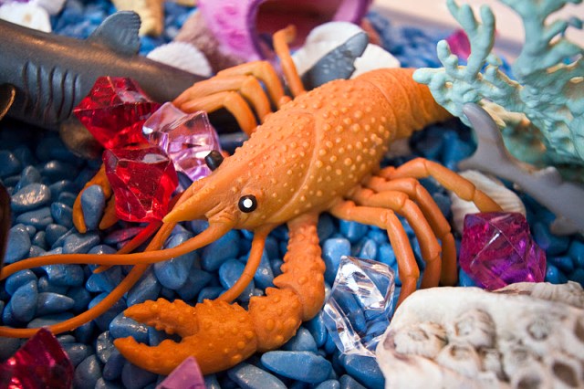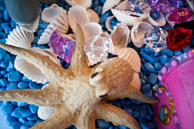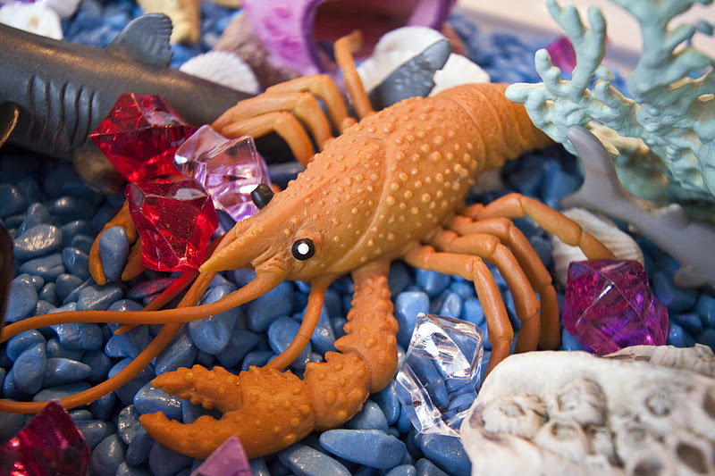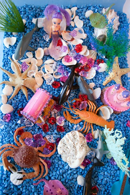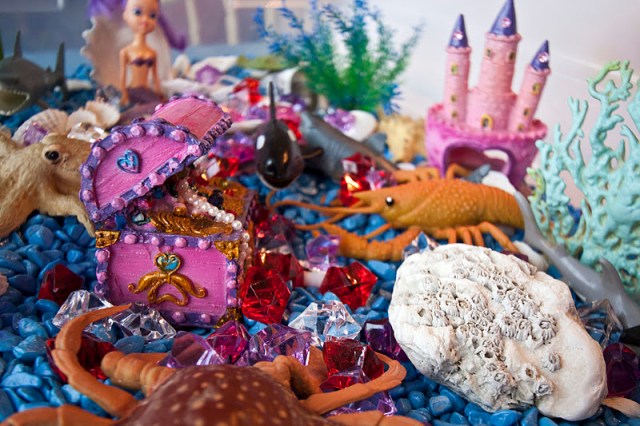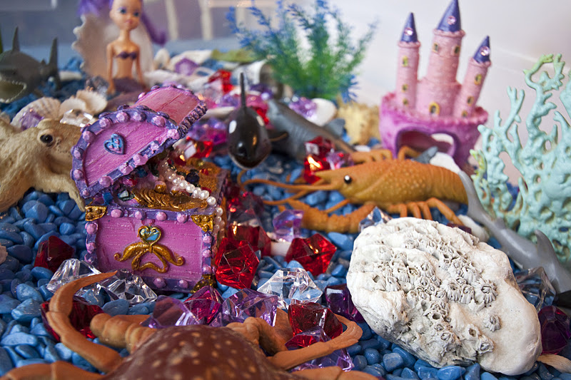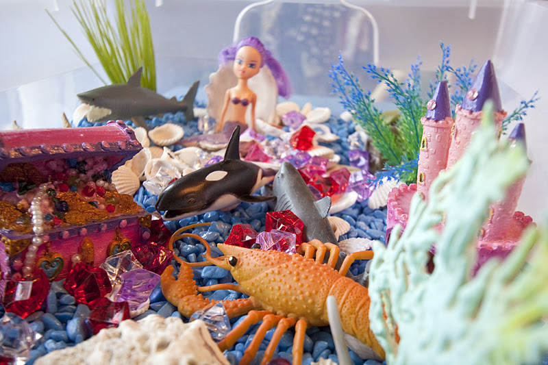 You can fill your under water kingdom with all sorts of plastic ocean creatures. We also put little 99cent aquarium plants in ours to make more places for little sea animals to hide.