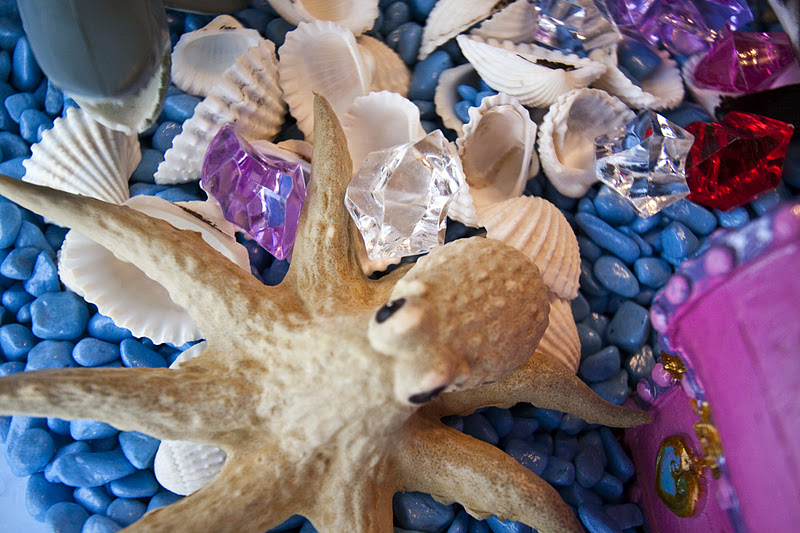 The substrate is 3 bags of aquarium gravel. Then we added a bag of plastic jewels, which we found in the fish section of the pet store. We also added 2 bags of store bought seashells…99cents/bag at Pet Smart. I also had some real oyster shells that I had collected on the beach in the spring so I put them in the box. My 6yr old daughter immediately fashioned an oyster shell chair for her mermaid.