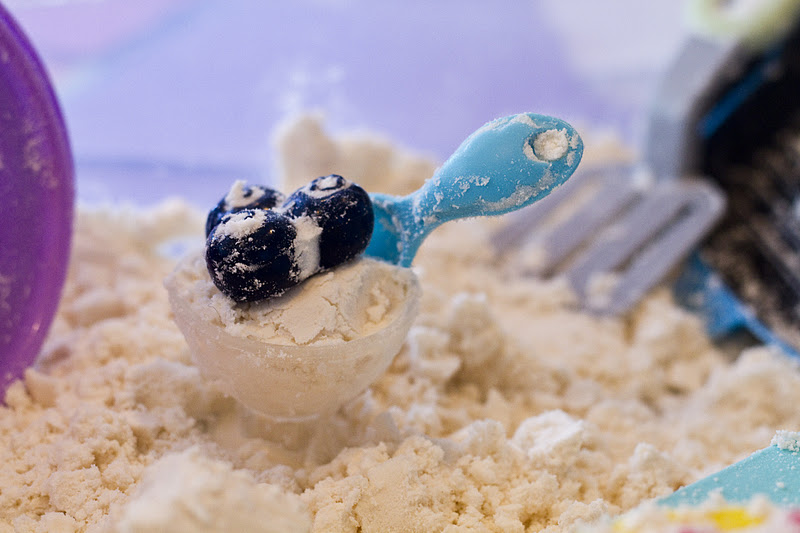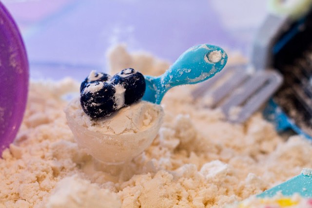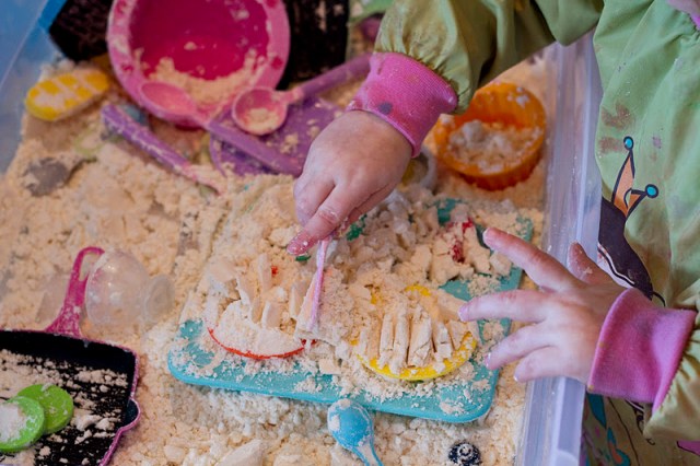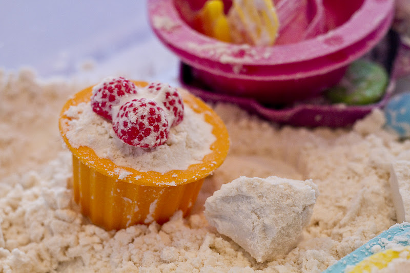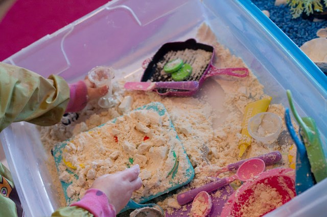 The “dough” will maintain its shape when pressed or packed, but will fall apart when little hands muss it up. It’s the perfect consistency for scooping, rolling, mixing, moulding, and “baking”.
