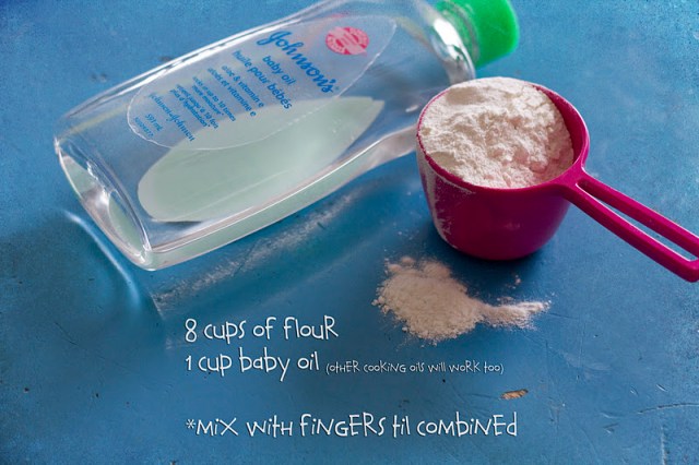 You can use any type of cooking oil if you wish. I use baby oil because it smells good! Mix all these ingredients INSIDE your bin to minimize the mess.