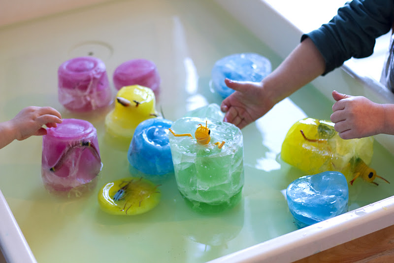 When they are frozen and you are ready to play, run the containers under hot water for awhile to loosen the ice blocks. Drop them into a bin or water table already half filled with water.