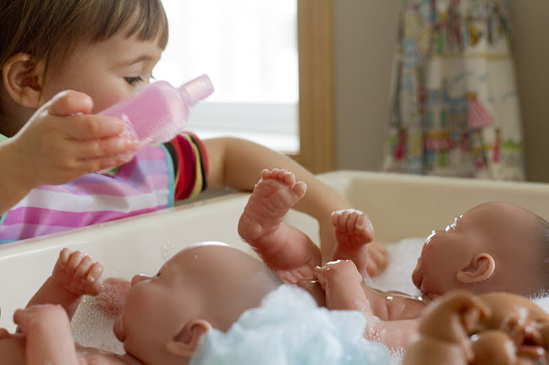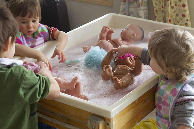 Good morning! We have reached day 3 of our water week already! This activity was geared toward the toddlers in my group. They love water. They love baby dolls. They love bubbles. So what could be better than a morning of bathing their dollies?