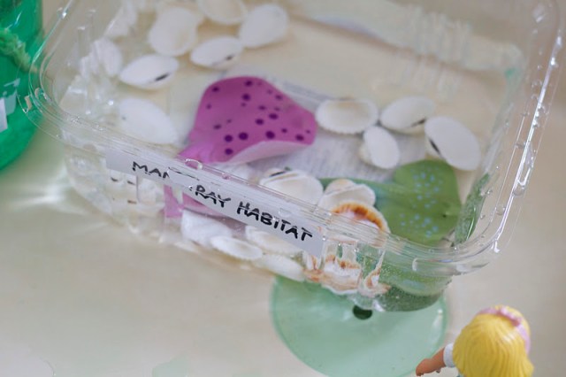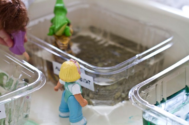 Now it’s time to build your habitats. I let the children decide which animals to put in each container and they chose all the accessories…