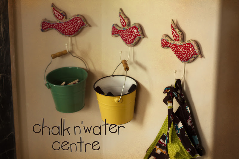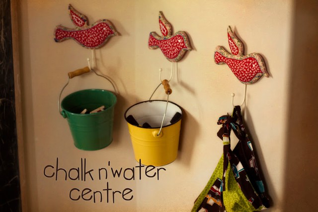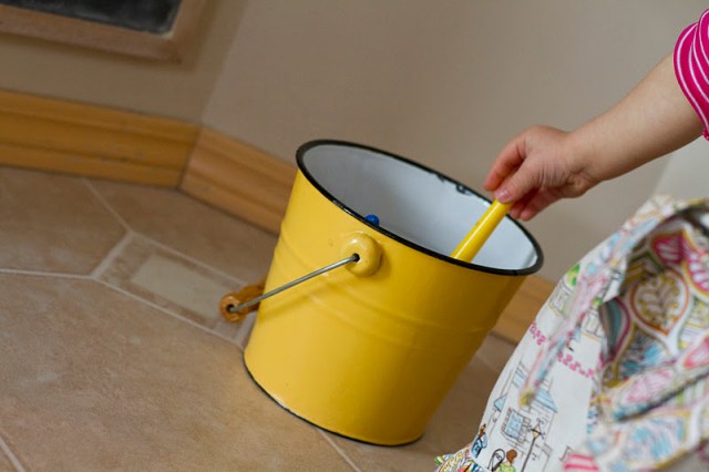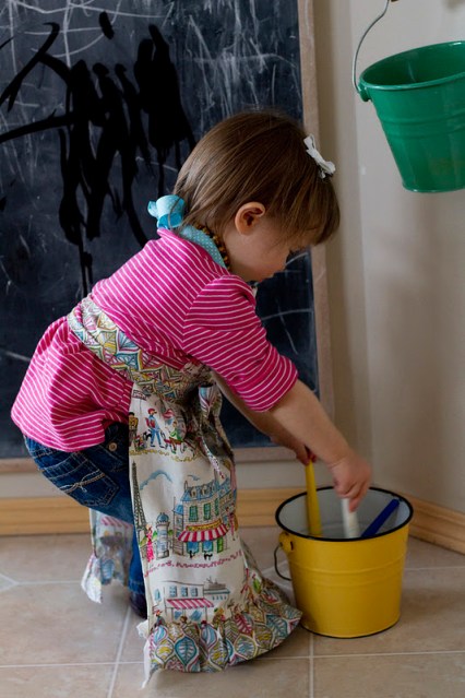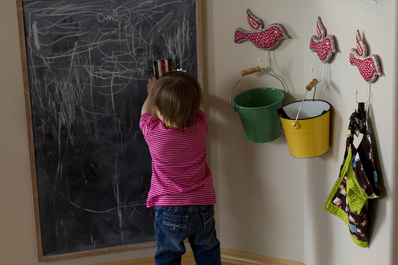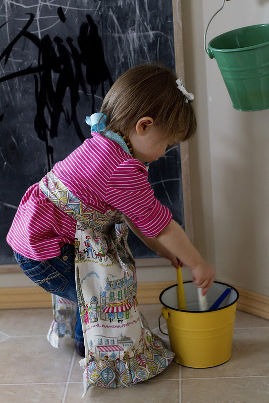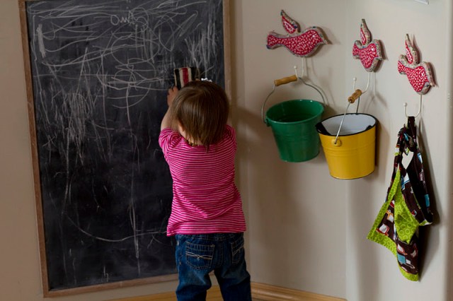 Well, didn’t I love this idea? The children could paint as they pleased, my furniture and carpets would remain safe, AND my chalkboard would get a cleaning! And so I added one more bucket to the wall. The first one contains chalk and brushes. The second one contains brushes, and when the kids want to paint, I unhook it from the wall and fill it with a bit of water and put it on the floor in front of the board.