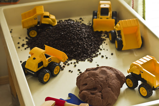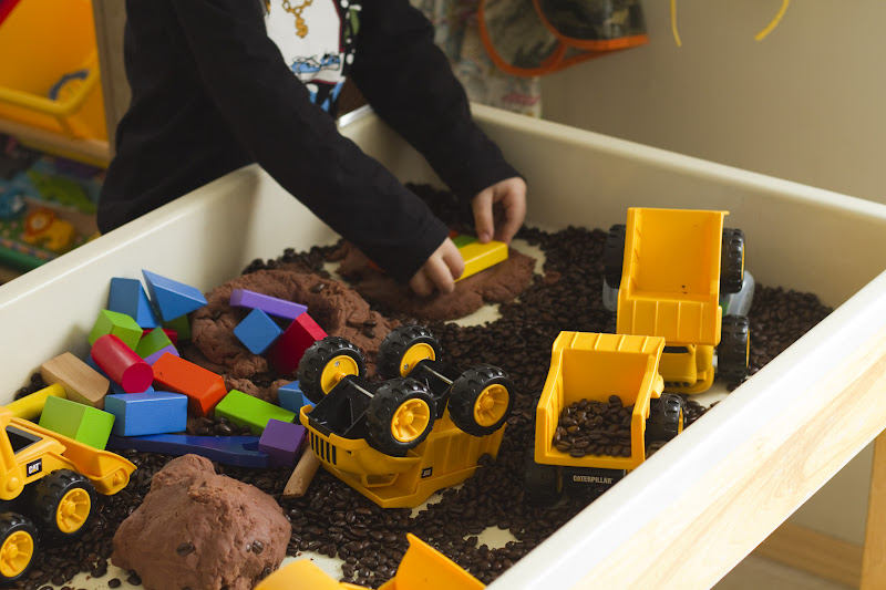 At first, they did exactly what I had expected. They poured and dumped the beans in and out of the diggers and dump trucks, and drove them up and over the playdough hill.