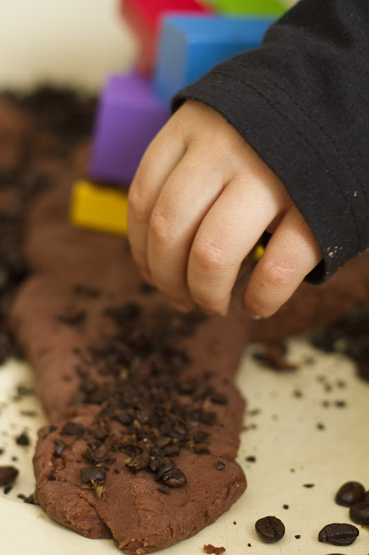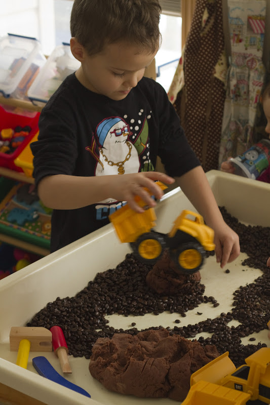 This activity was one of our most successful ones here at Small Potatoes. The boys took the play to places I would have never even thought of. What started out as a pile of coffee beans and a mound of chocolate playdough, (recipe from the lovely NurtureStore) turned into hours of creative building, dumping, sculpting, crushing, rolling, and most of all, IMAGINING!
