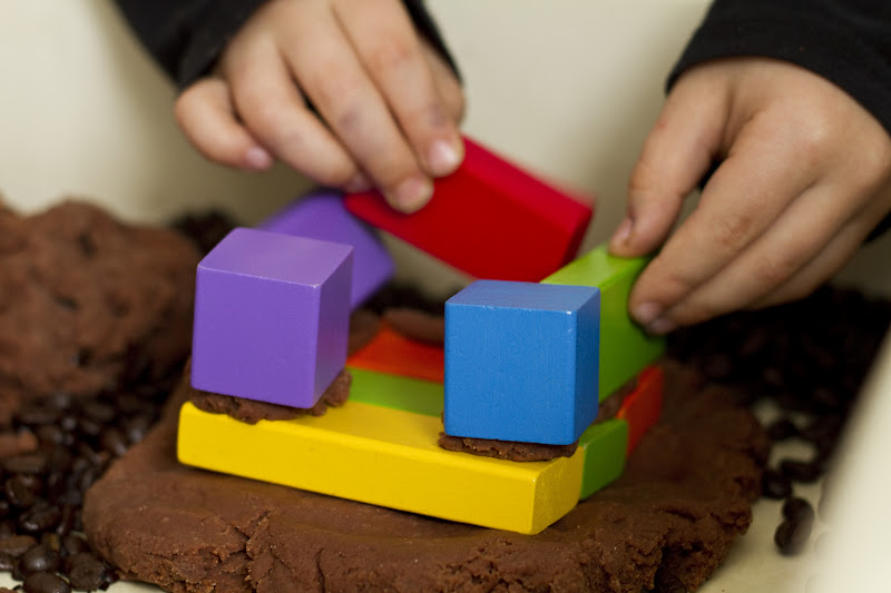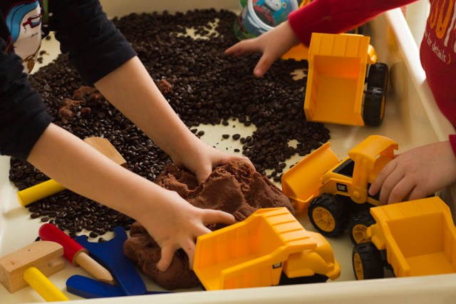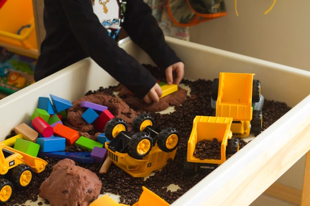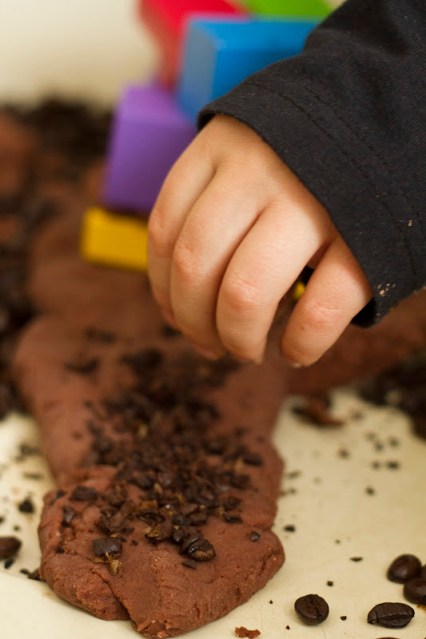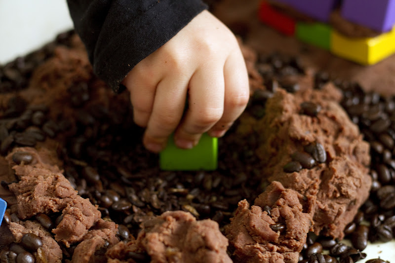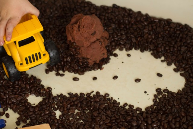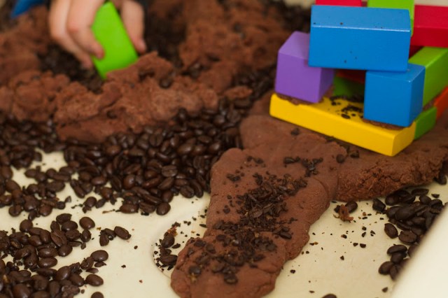 I poured a large bag of cheap (Western Family brand) coffee beans into our process table. I added some plastic construction trucks (found at Toys R Us), and some wooden play tools. I made a double batch of the chocolate playdough and plopped it in alongside everything else. Then I let the kids have at ‘er!