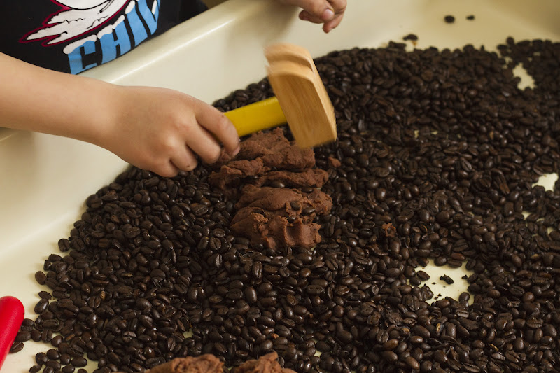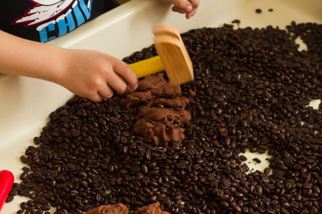 So I was able to enjoy the smell of coffee and chocolate all through my house (seriously, it smelled like Starbucks), and the boys spent the afternoon immersed in imaginative, sensory play. Win win! I packed the playdough into a plastic container at the end of the play session and we kept the beans in the process table for a good week. I brought the playdough out for them each time they asked. They absolutely loved this activity. And so did I.  If you don’t have a process table, don’t fret…just use your table top, or a large plastic bin. You will be sweeping up beans, but it’s a fair trade when you see how much fun your little ones are having!