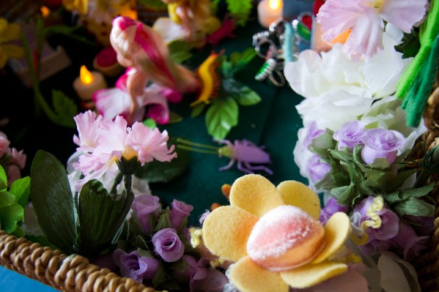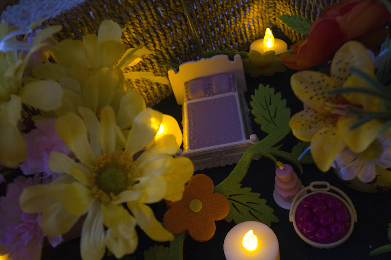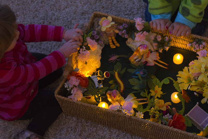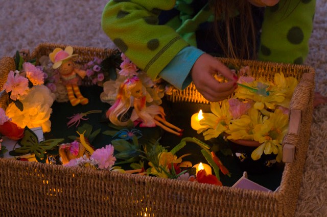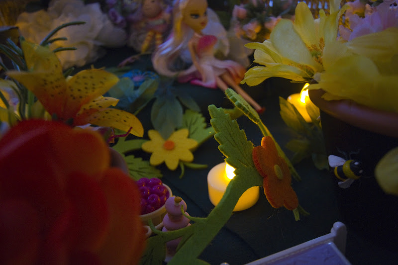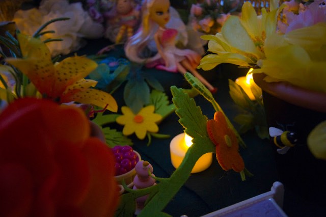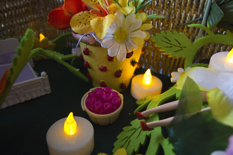 The felt “flower vine” is from the scrapbook section of the dollar store. It can be picked up and moved around also. The flower fairies and battery operated tea lights are also from the dollar store.