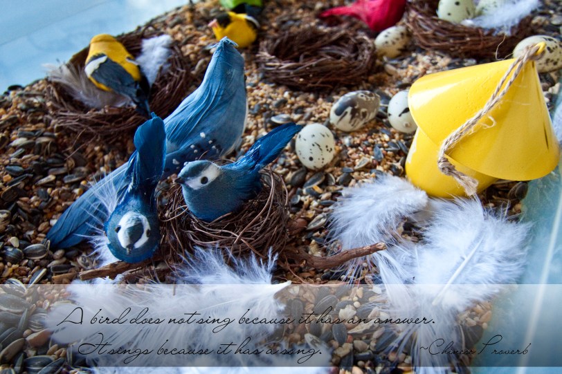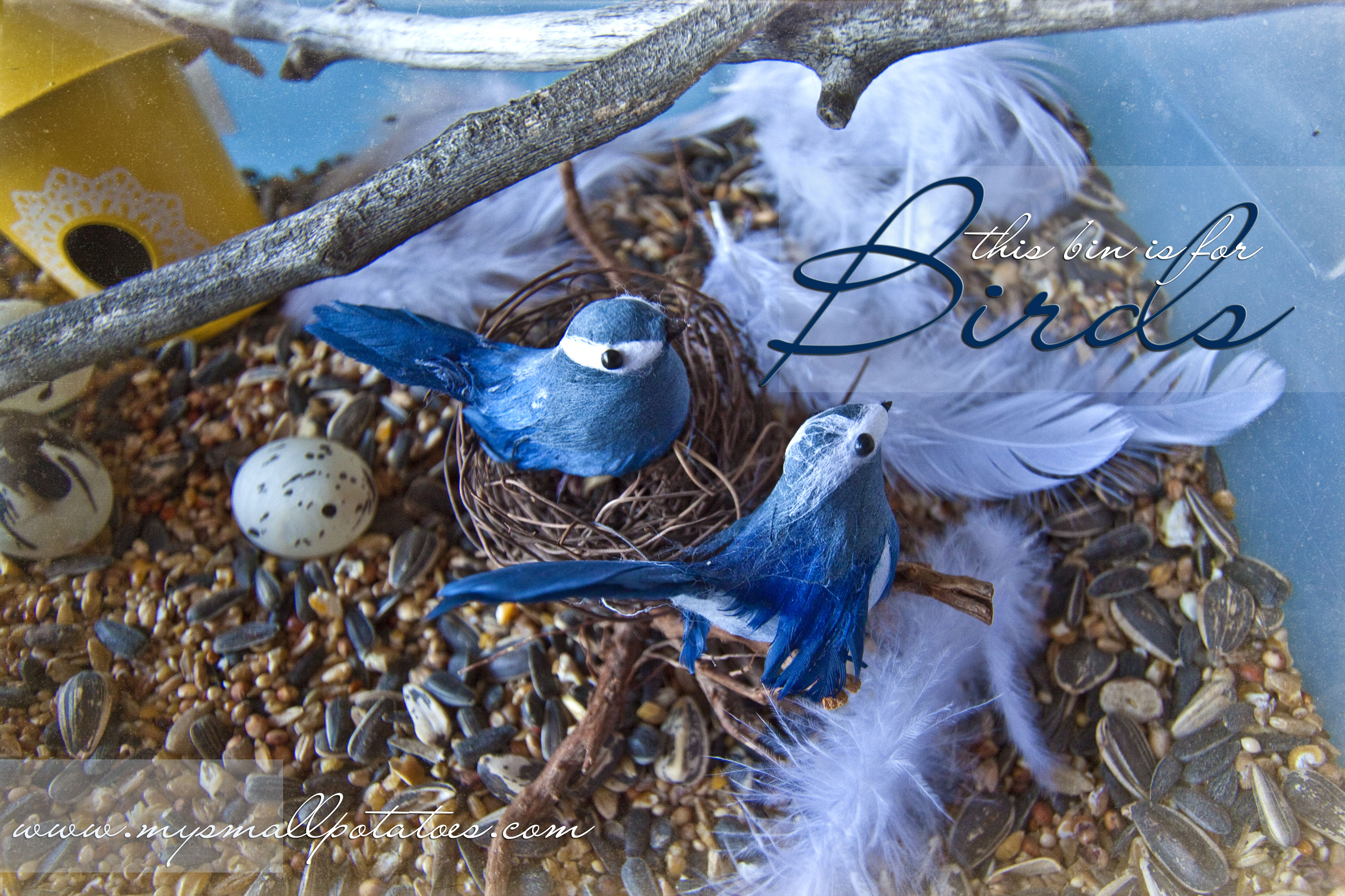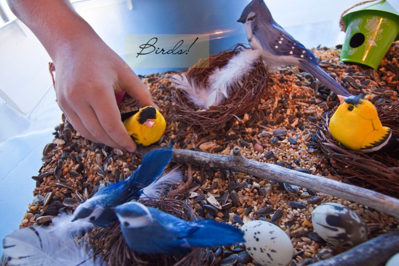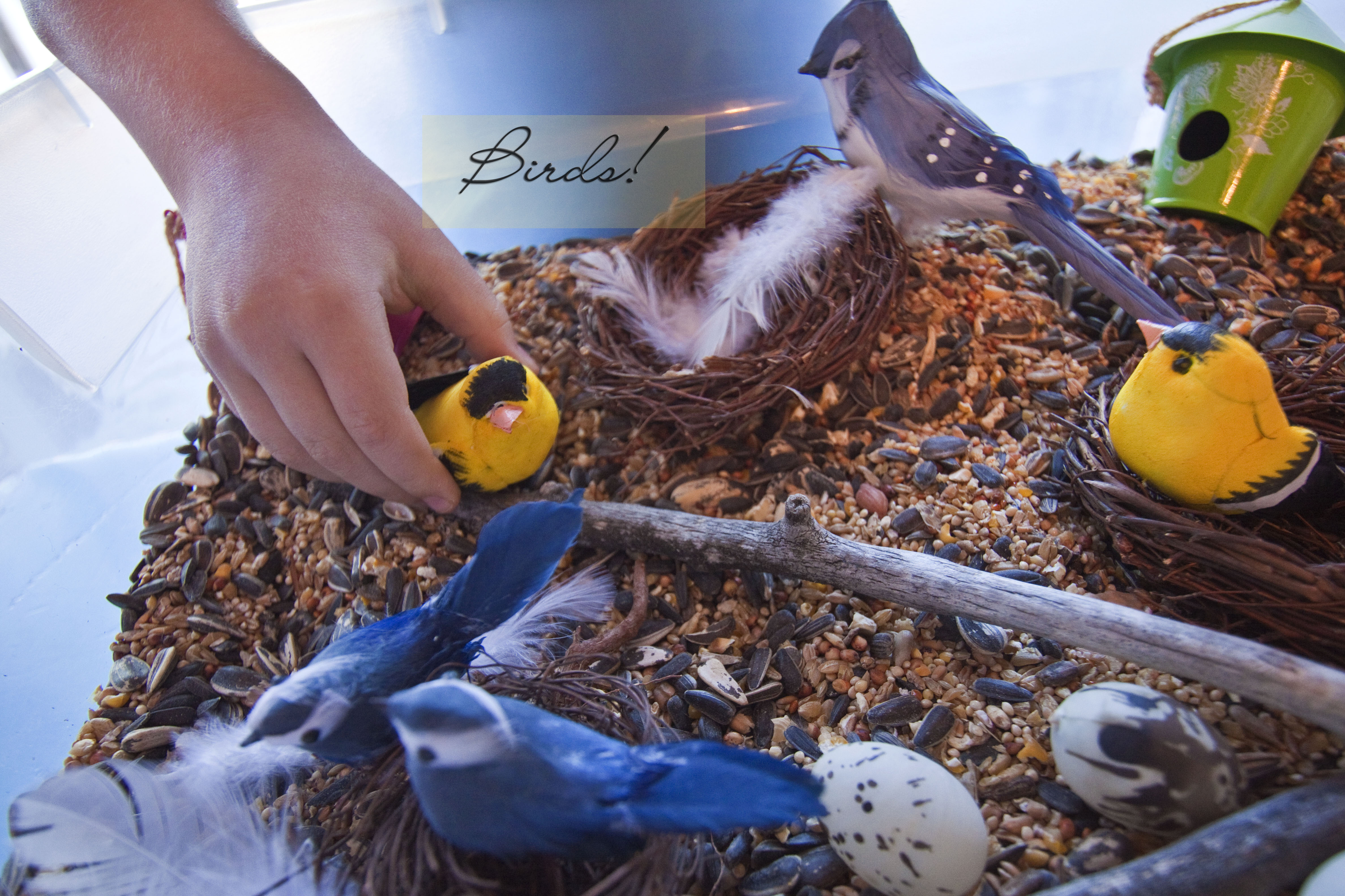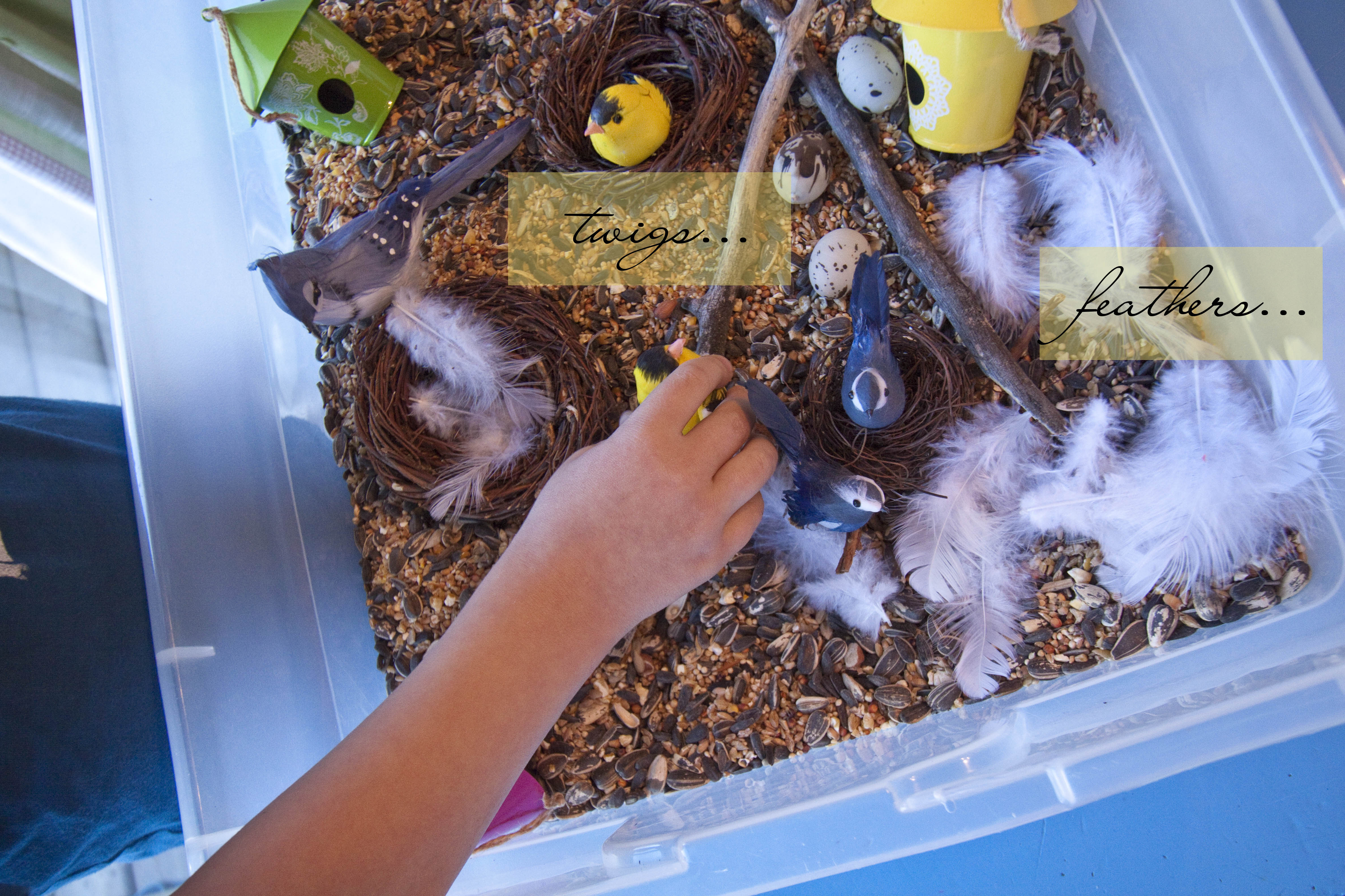 We have been seeing little tan birds with red heads and bellies, we are seeing the little brown swallows, oh…and the crows! Don’t forget the crows! Although, they are so loud, I don’t suppose we could if we tried! The kids and I try to sneak up the patio window very quietly so we can watch their silly bird antics without frightening them. We have enjoyed our bird-sightings so much, we have decided to do a whole unit on these little feathered creatures. And what is my favorite way to introduce a new unit? A sensory bin, of course! Hehehehehe!