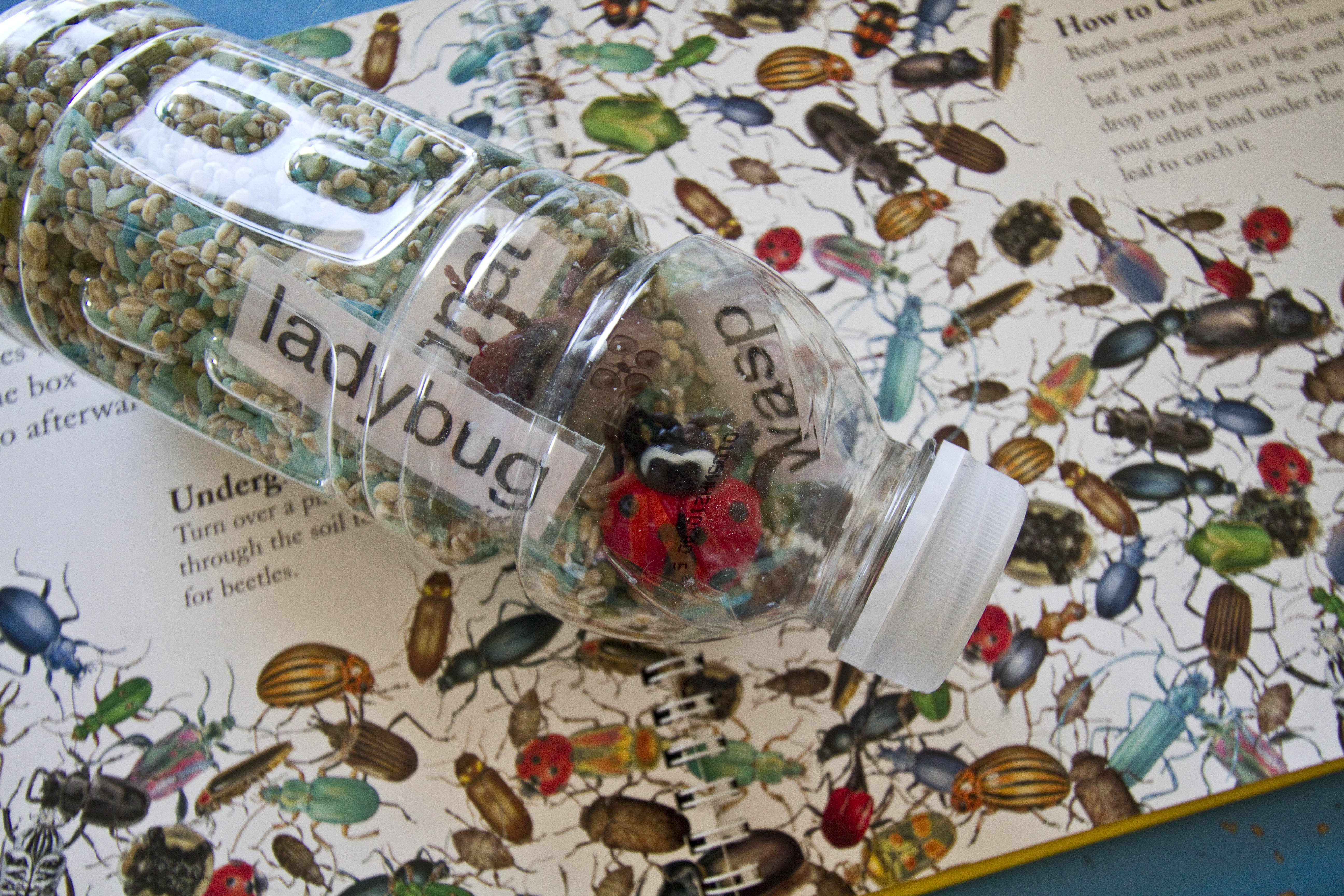This is our bug bottle. Most popular with the boys. I paired it with a non-fiction bug facts book with beautifully drawn illustrations. The bottle is filled with blue rice, barley, split peas, and plastic insects.