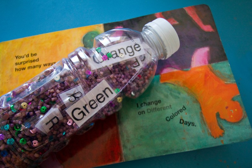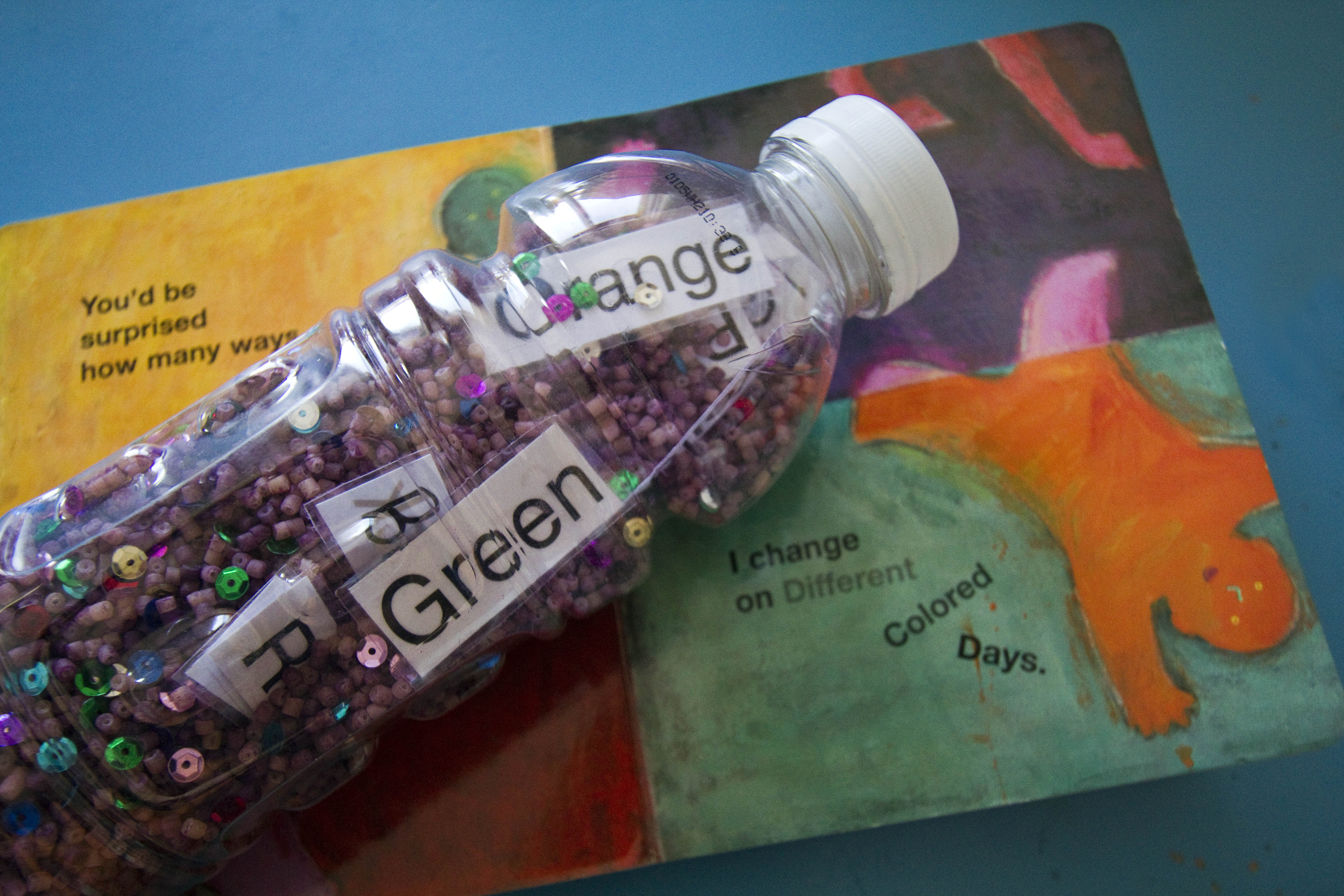 This is my favourite bottle. Mostly because it’s paired with my favourite Dr. Seuss book, My Many Colored Days. We read this book a lot. We use it in our yoga class. And now we use it in our book bin. The bottle is filled with coloured pasta and sparkly sequins. When we find the colour words in the bottle, we “act out” the colour’s feeling in the book. Oh, it’s a fun one!