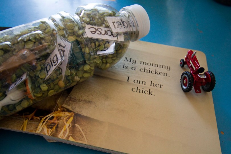 I chose a book from our shelves for each bottle so the children could find the words in the books AND the bottles and match them up. This is our farm animal bottle. It is filled with split peas, double-sided, laminated farm words, and little plastic farm animals. It is paired with a baby farm animal board book. This pair is a favourite among the toddlers. We find the words and make the animal sounds together.