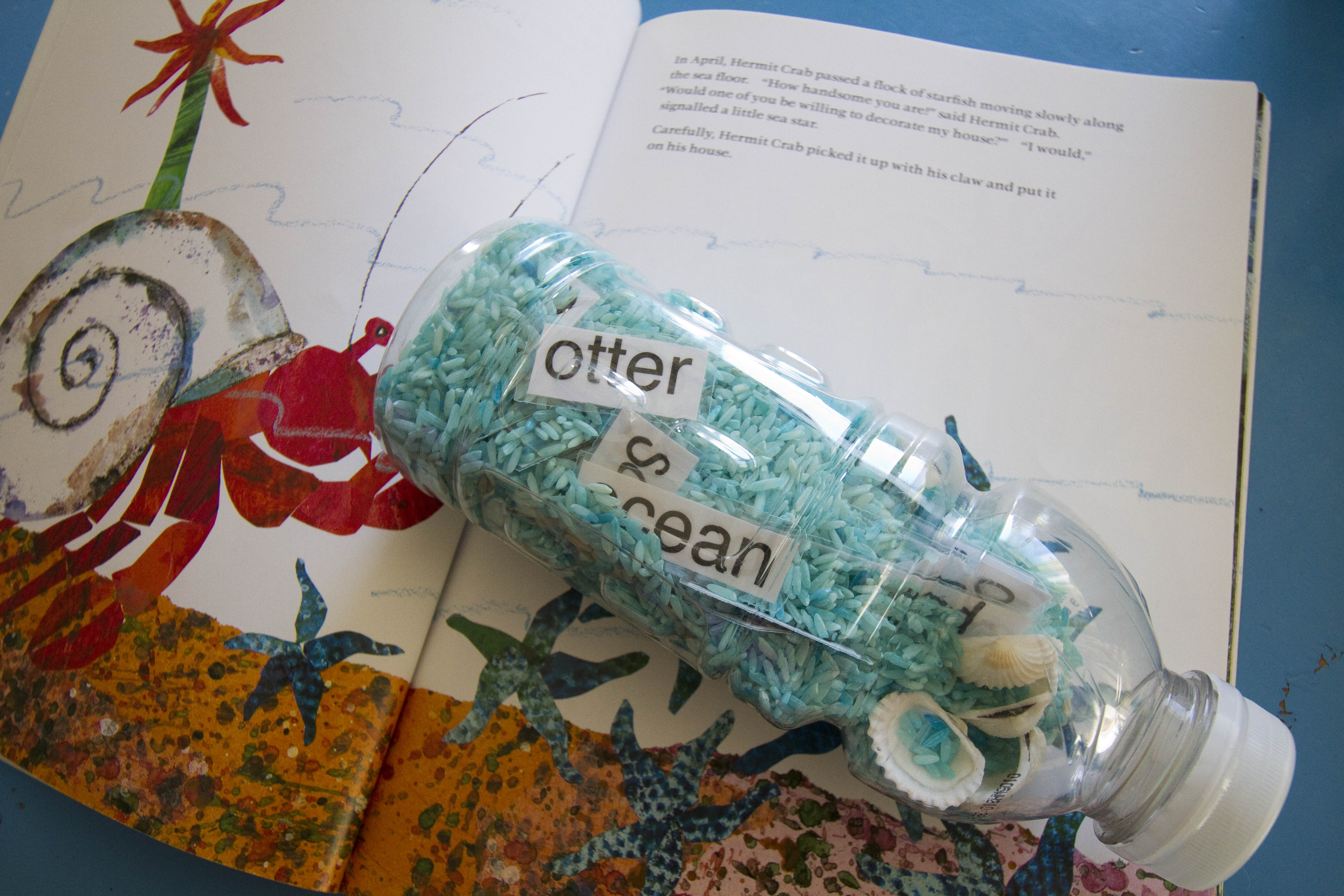 And finally, our ocean themed bottle. It is filled with blue rice, little seashells, and a few plastic whales and sharks. I paired it with Eric Carle’s, A House for Hermit Crab, but you could pair it with any underwater, “ocean-y” book you like. We just like this one especially.