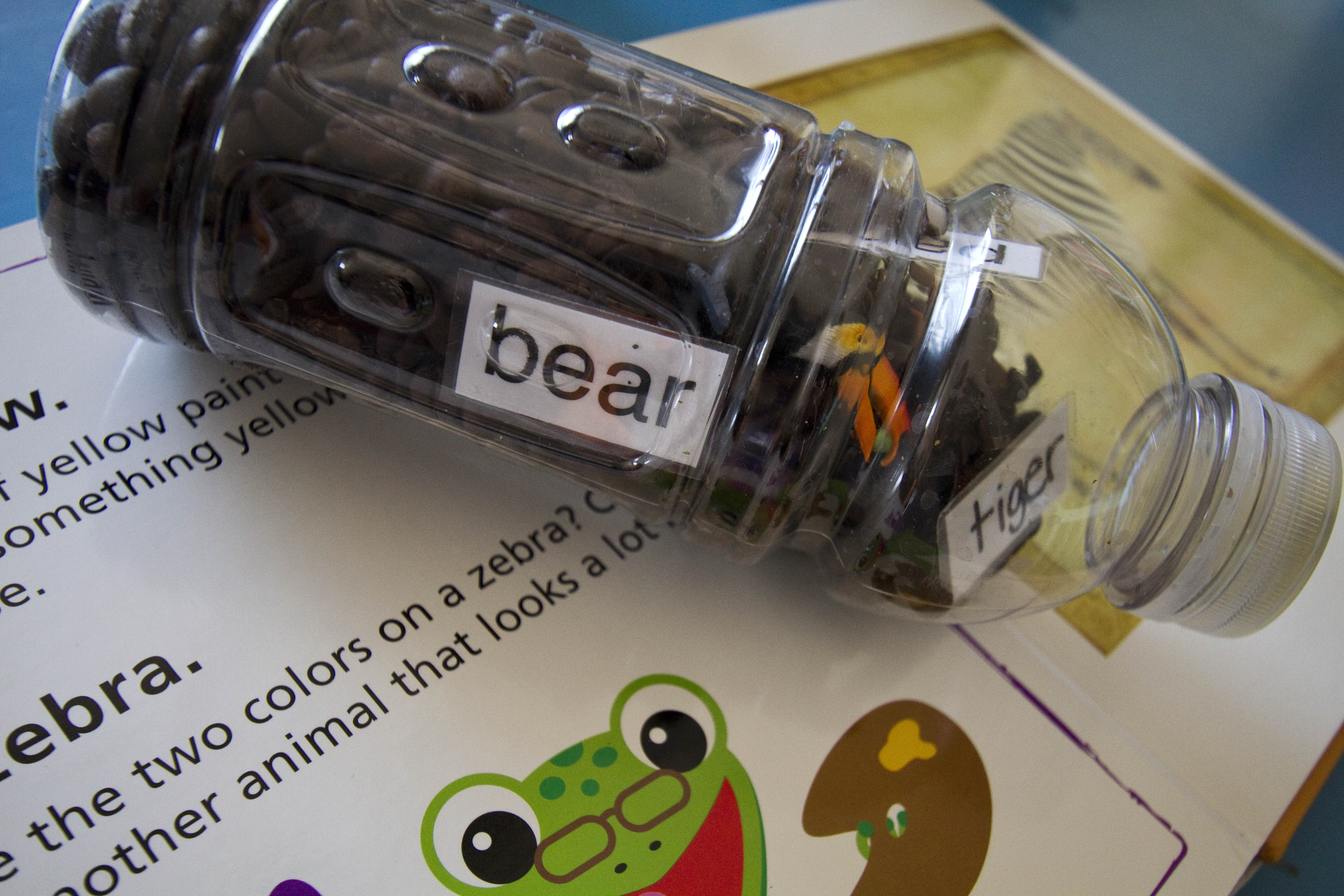 This is our zoo animal bottle. It is filled with coffee beans and plastic toy animals. I paired it with a Little Einstein’s first words board book.