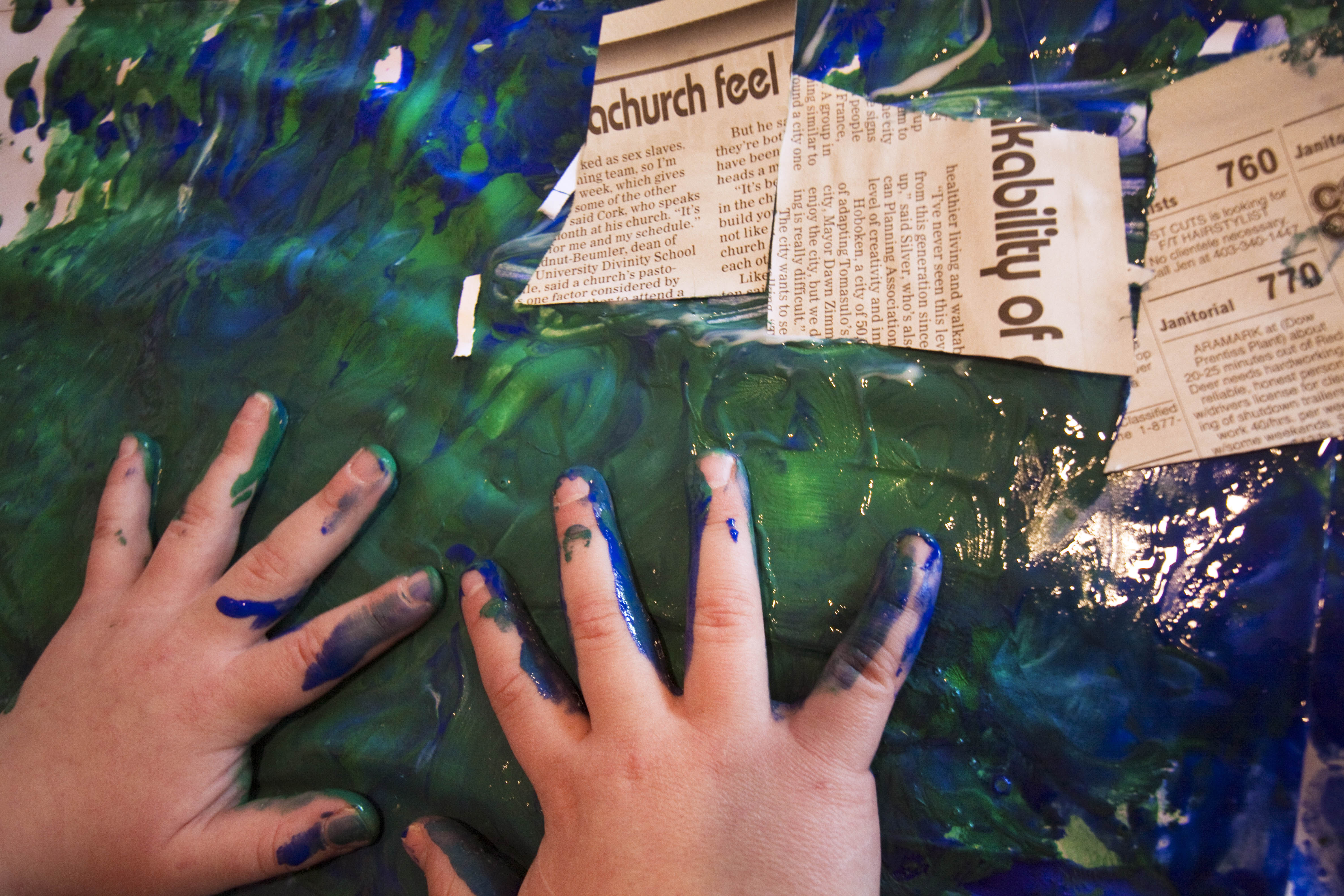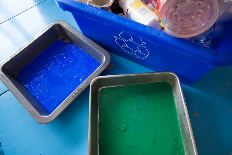 So…we made a couple of cake pans filled with paint. Green and blue for the colours of the earth.  Then we hauled our recycling bin down to the art centre.
