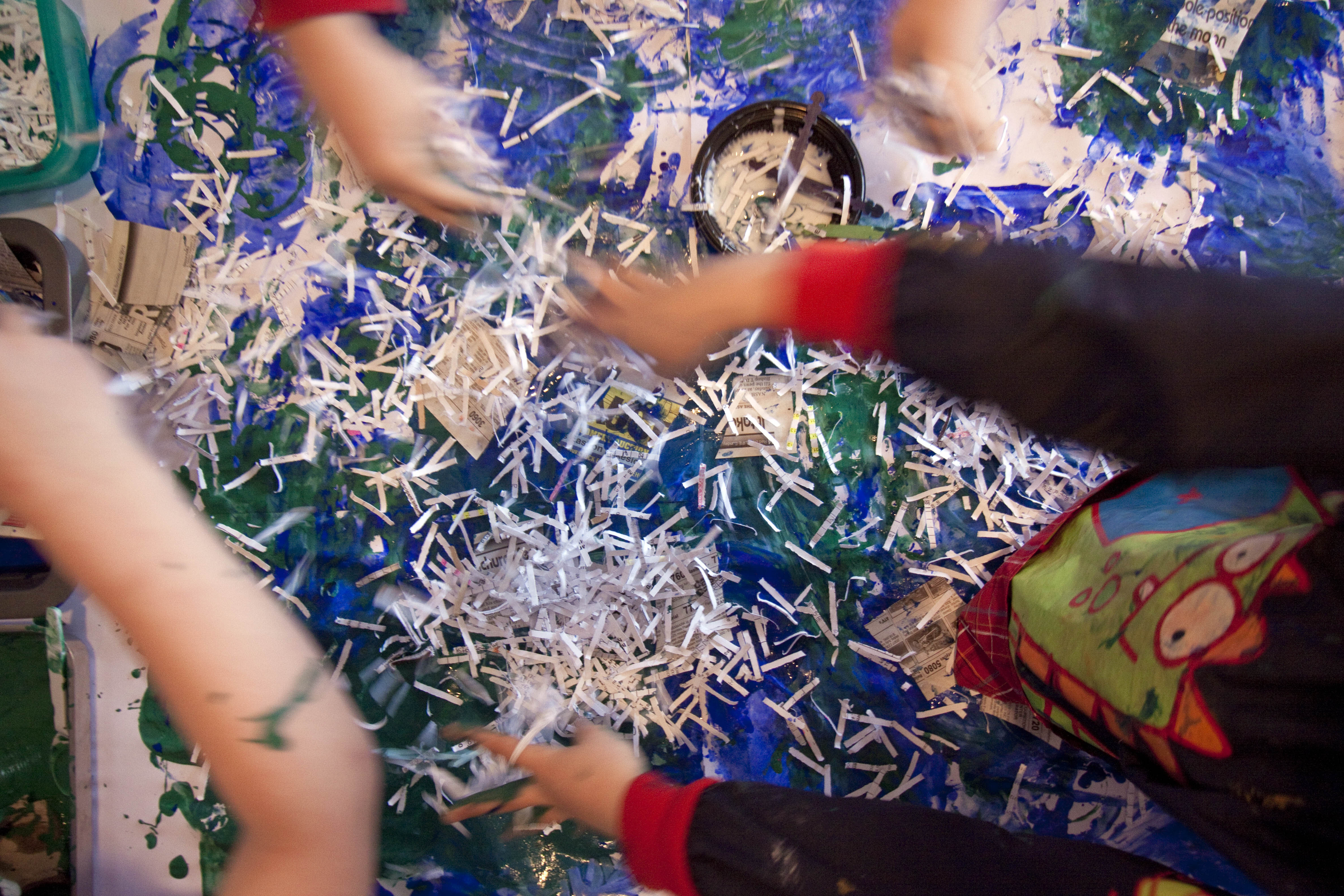 When bigger kids came home from school, they got in on the action. This is when I brought out a bowl of glue, shredded paper, and newspapers from the recycle bin.
