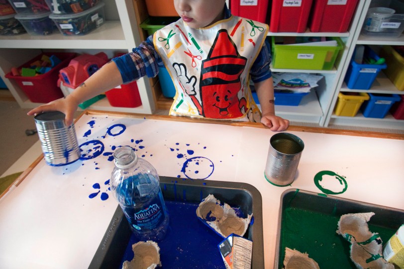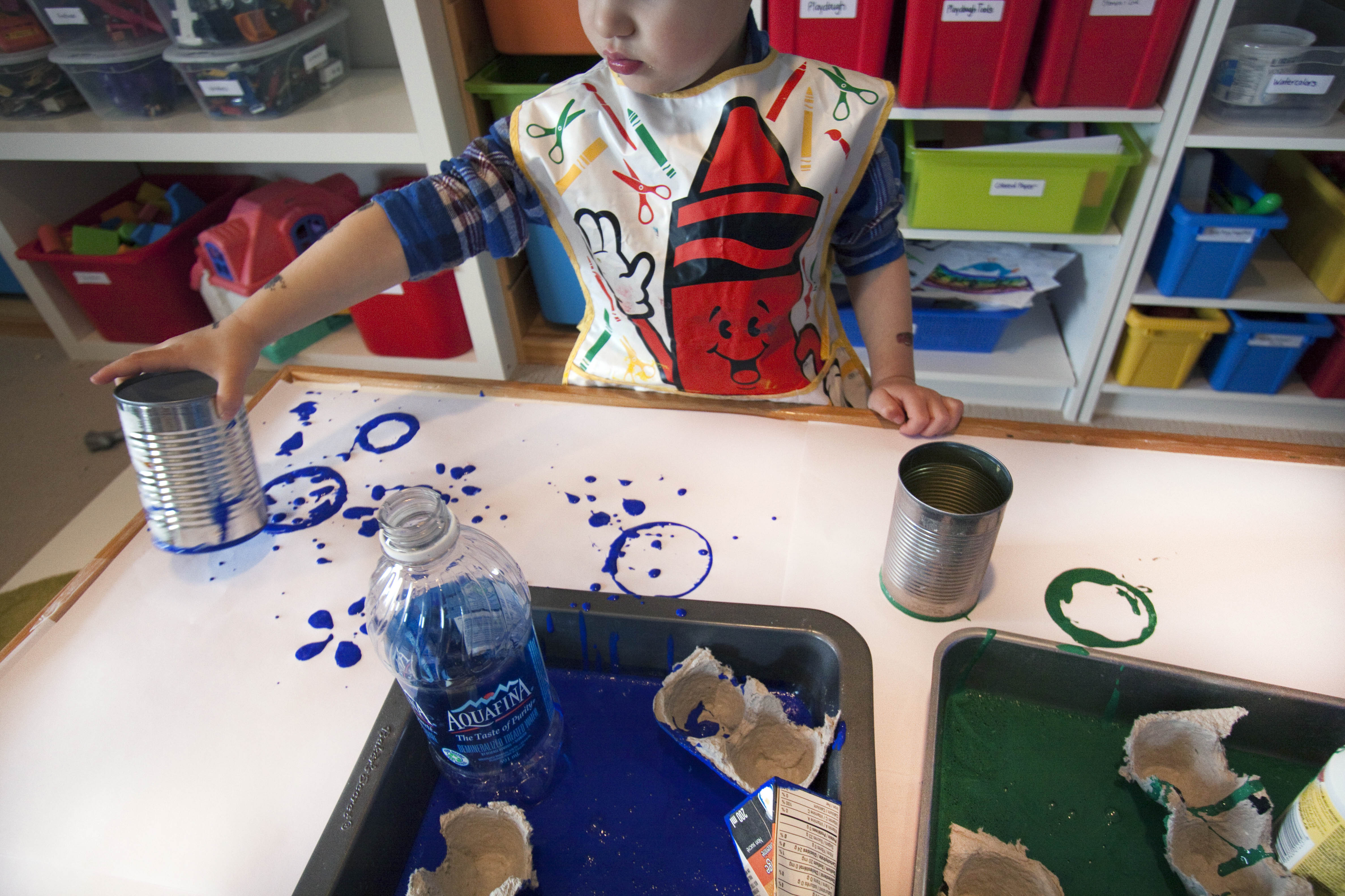 They started out carefully and tentatively. Experimenting with each recycled item to see what kind of print it made. The toddlers especially loved banging the soup cans on the table. Oh, and I forgot to mention, I taped paper to the table so the paper wouldn’t lift during the printing process. There is nothing more frustrating to a toddler than a paper that won’t stay put!