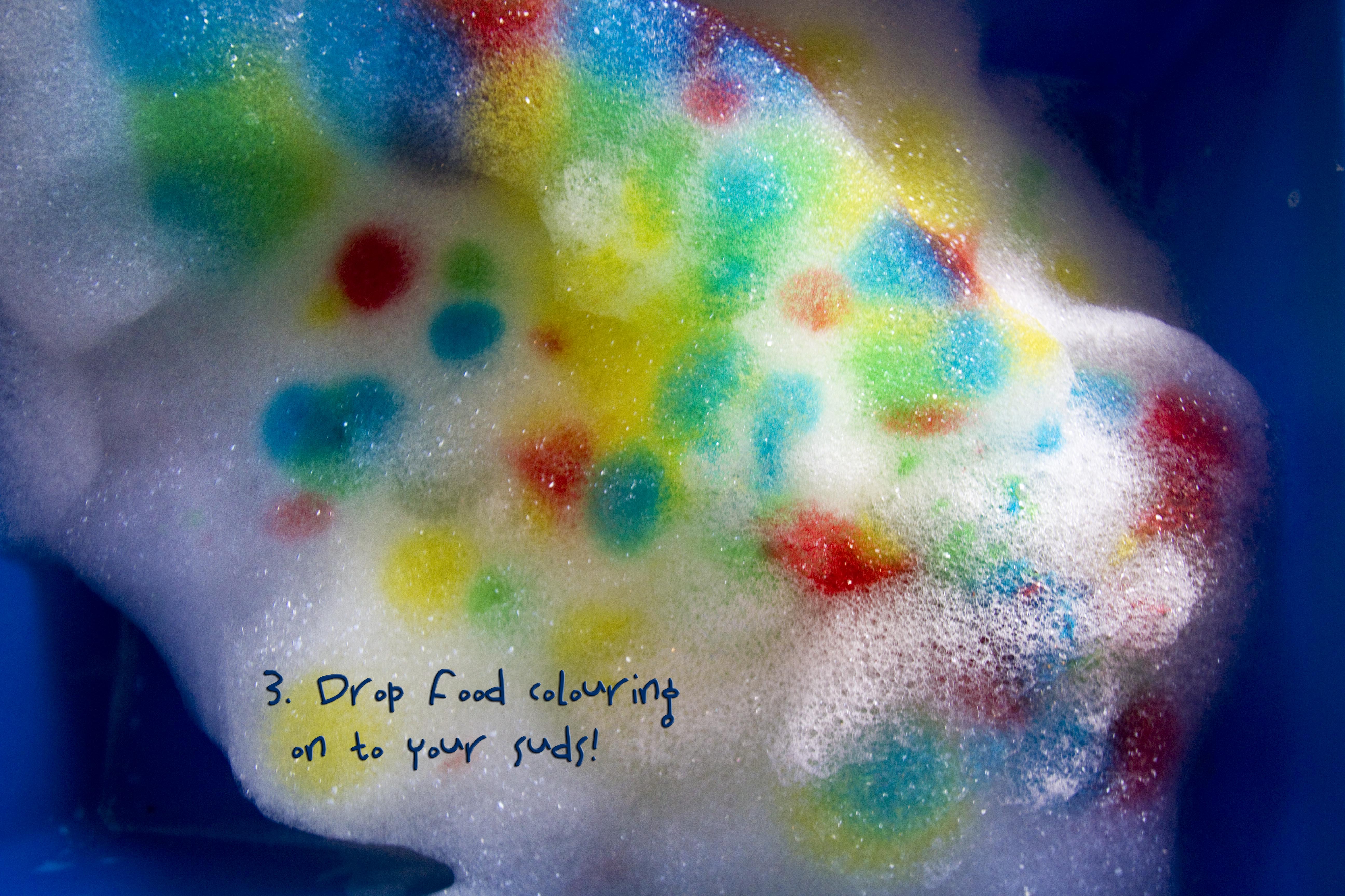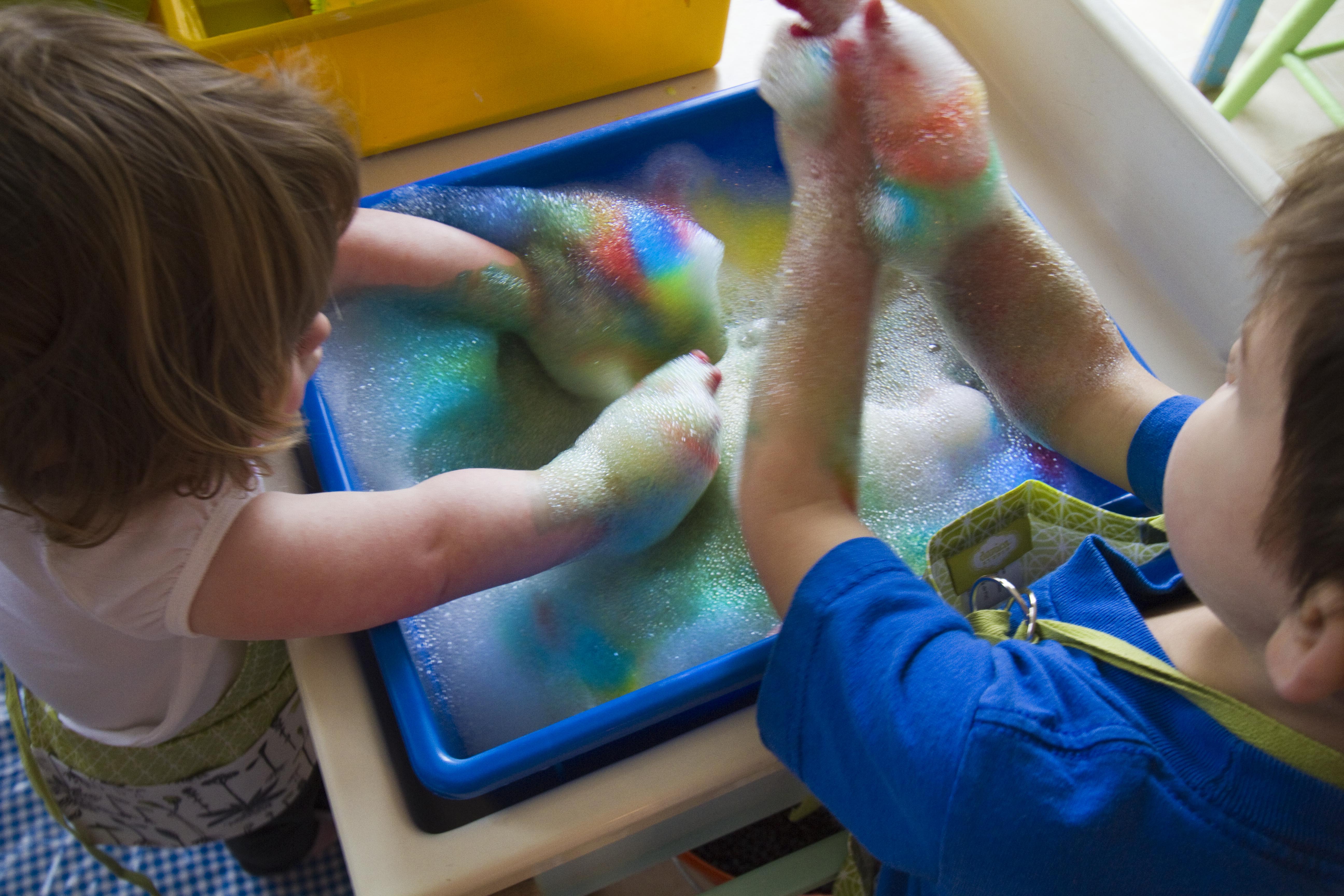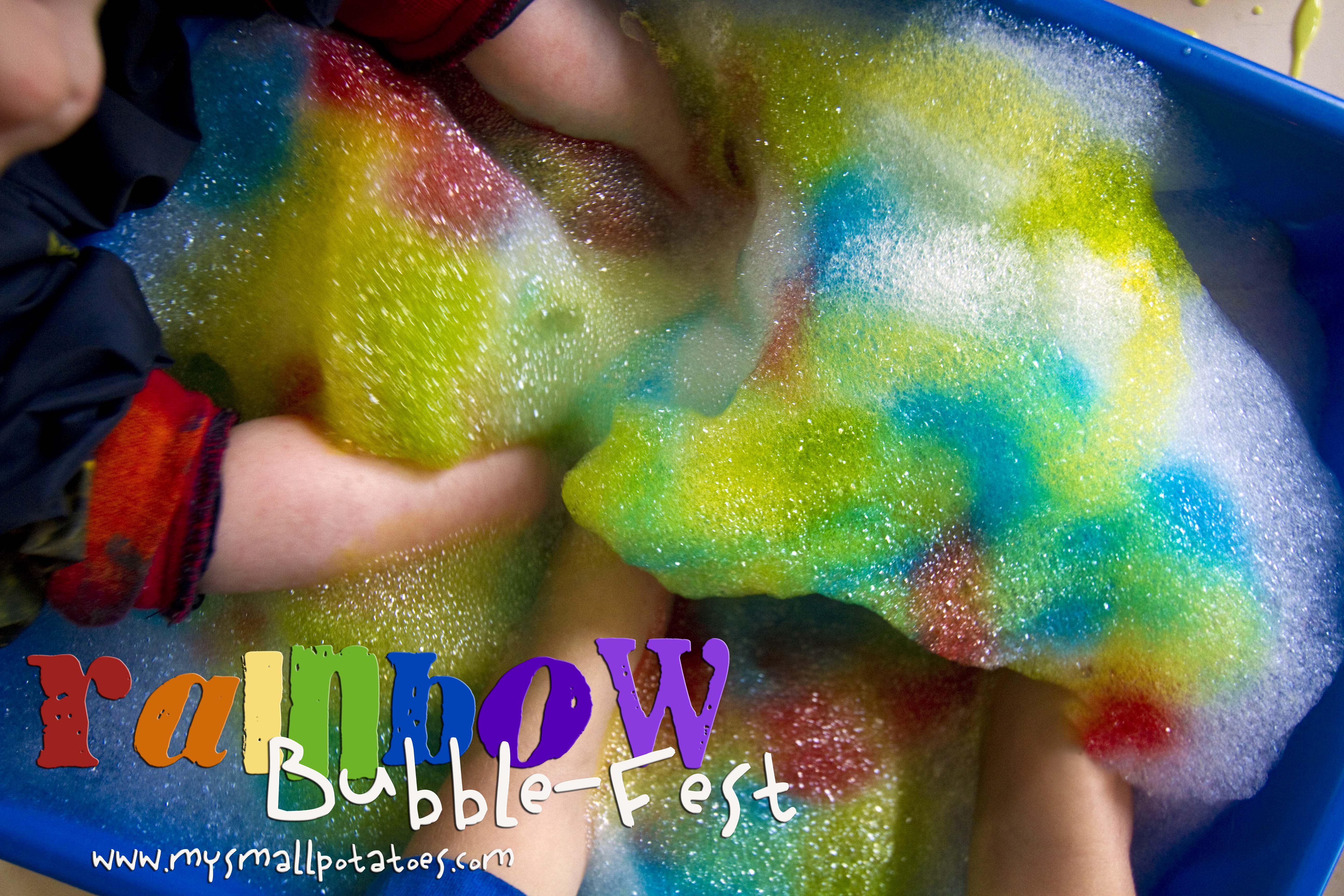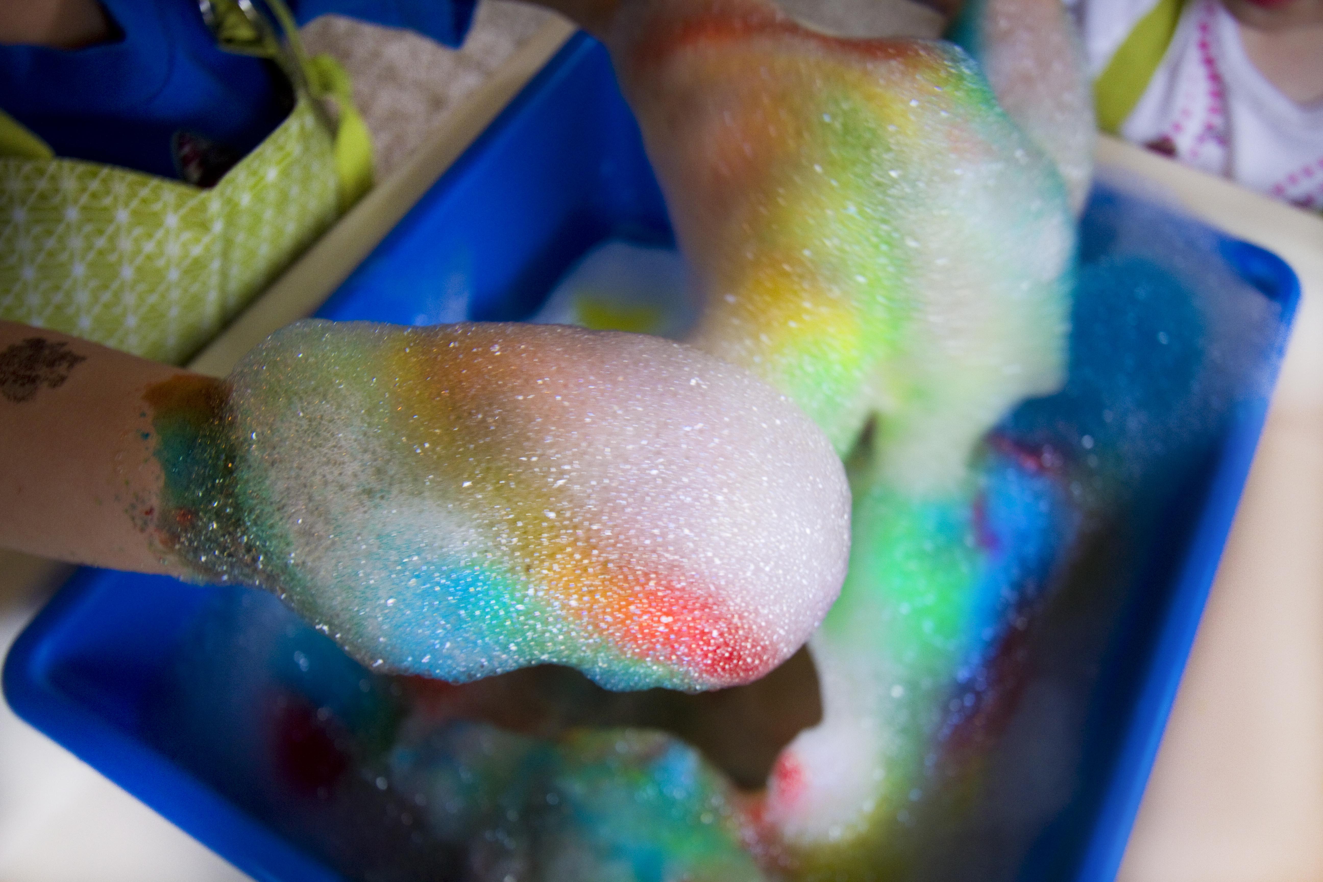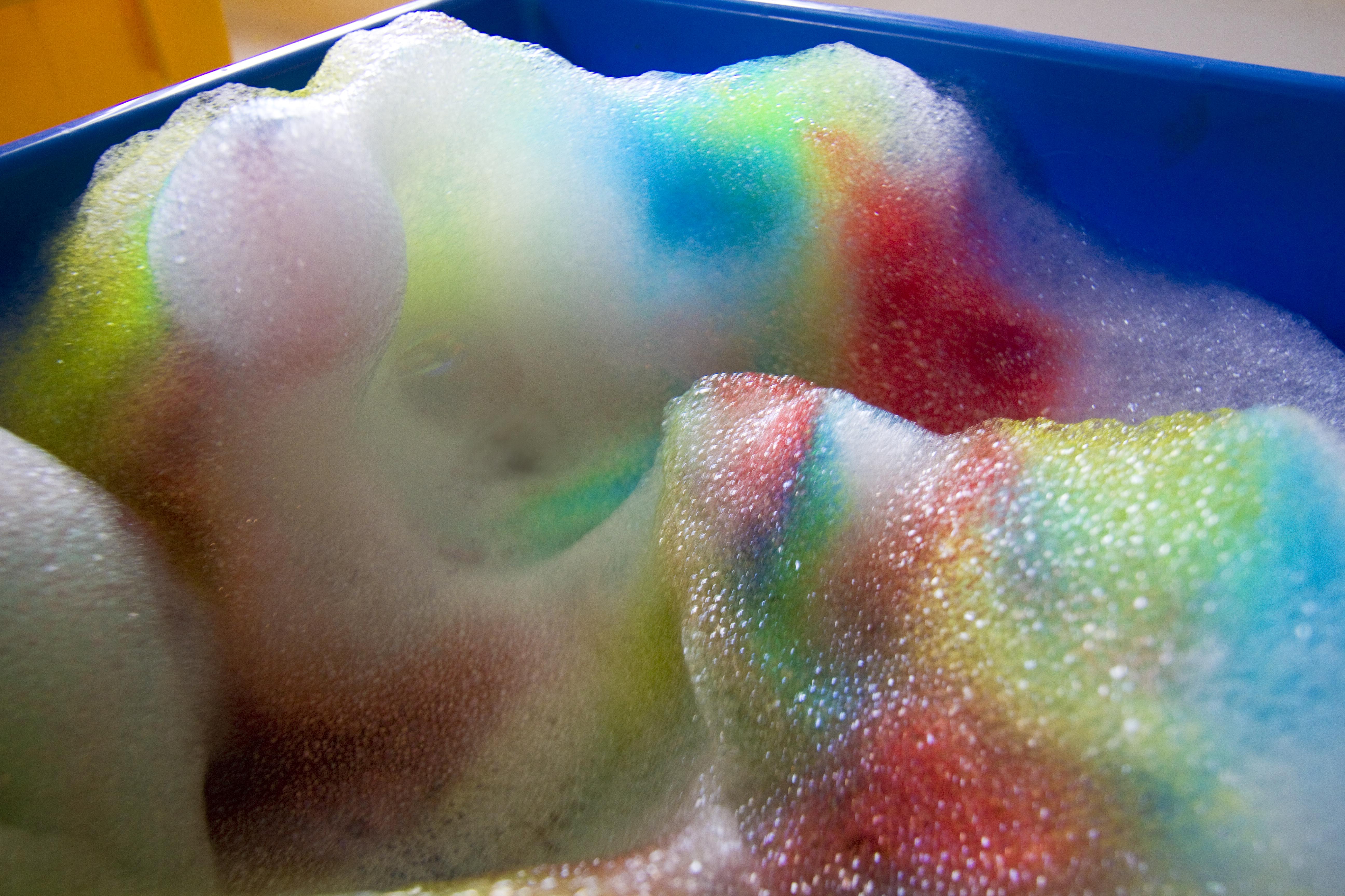 Sudsy rainbow peaks, bubble mittens, and a lot of happy, colourful children! You can’t beat that on a yucky, grey day!