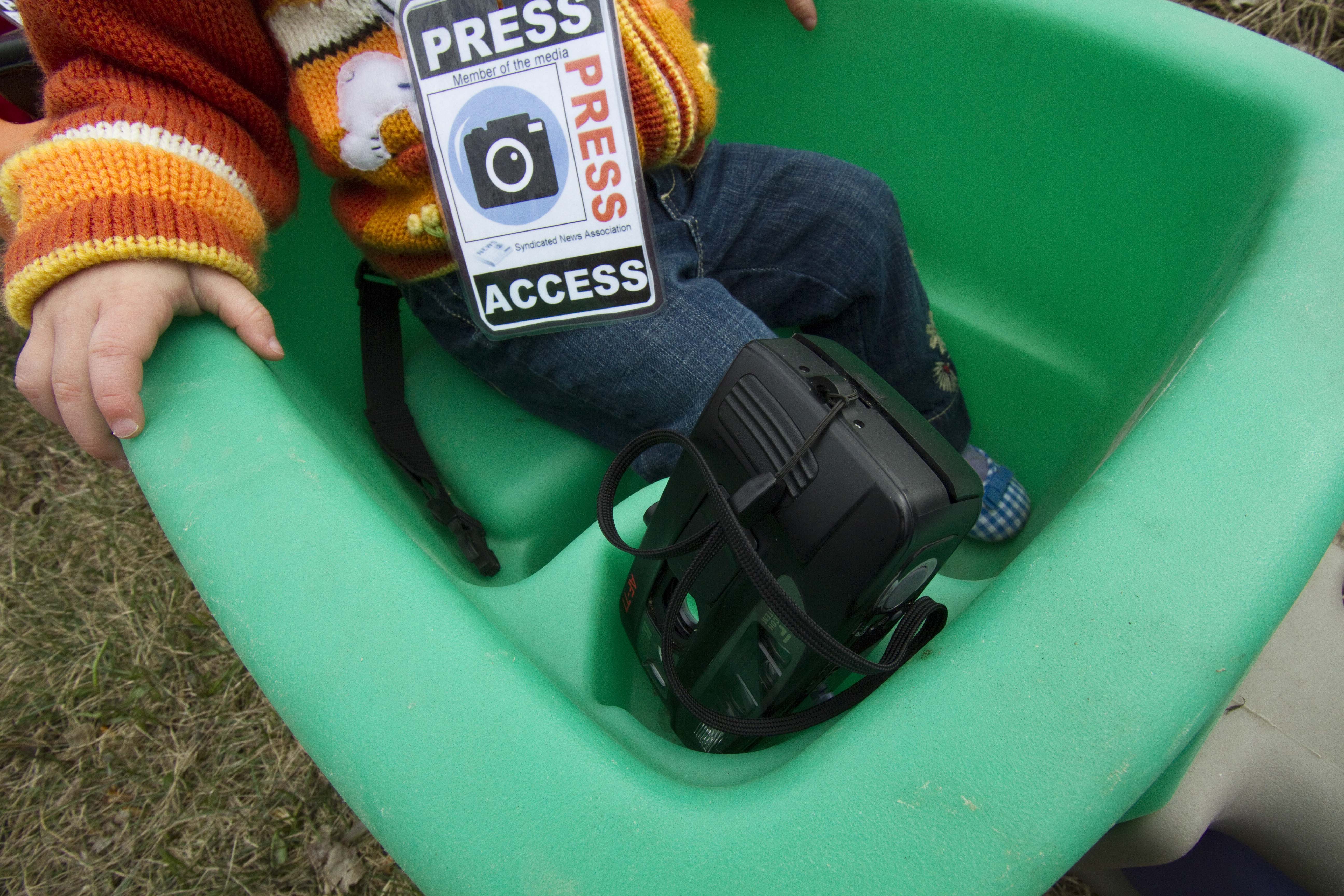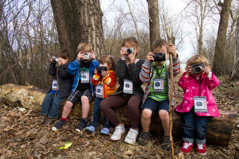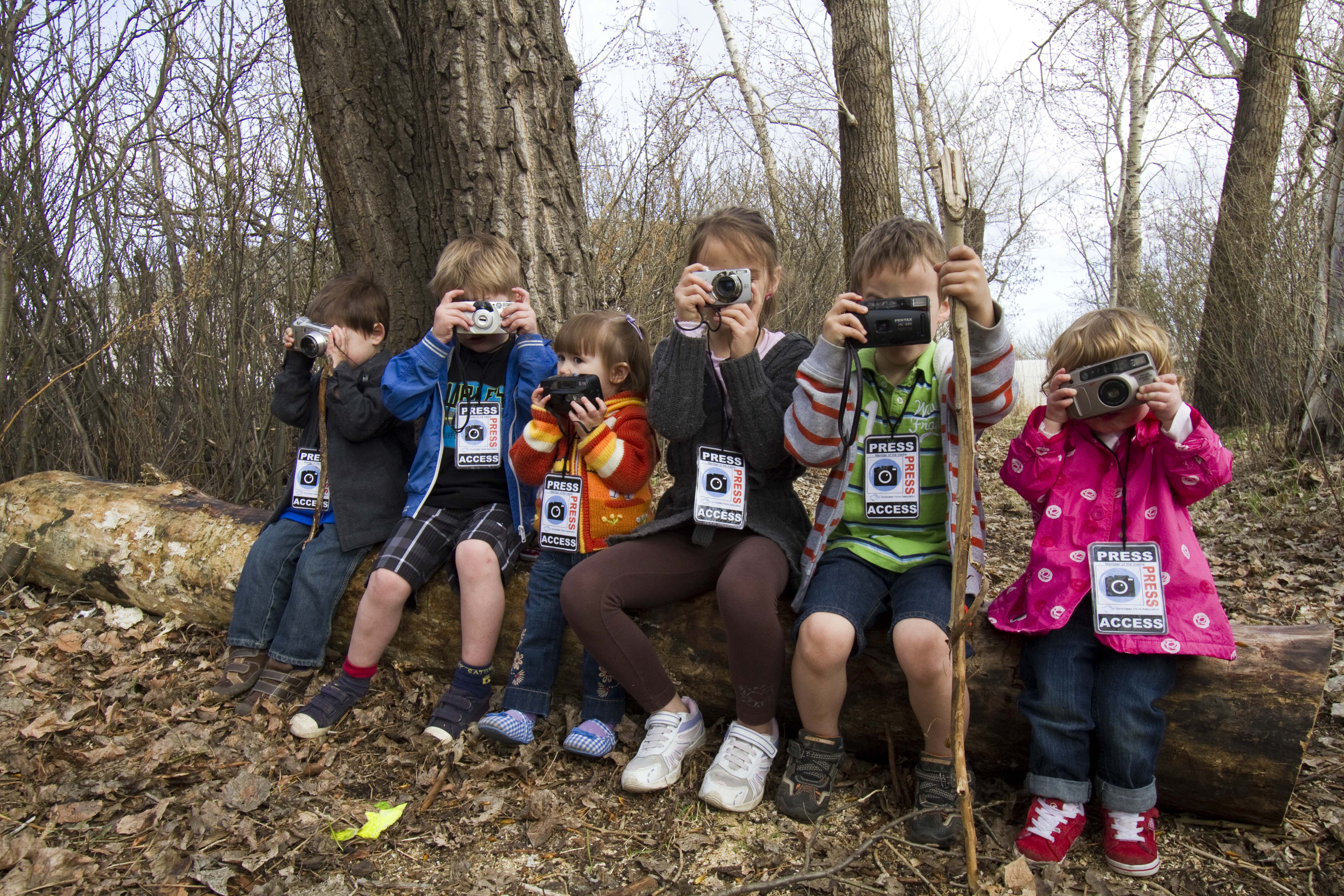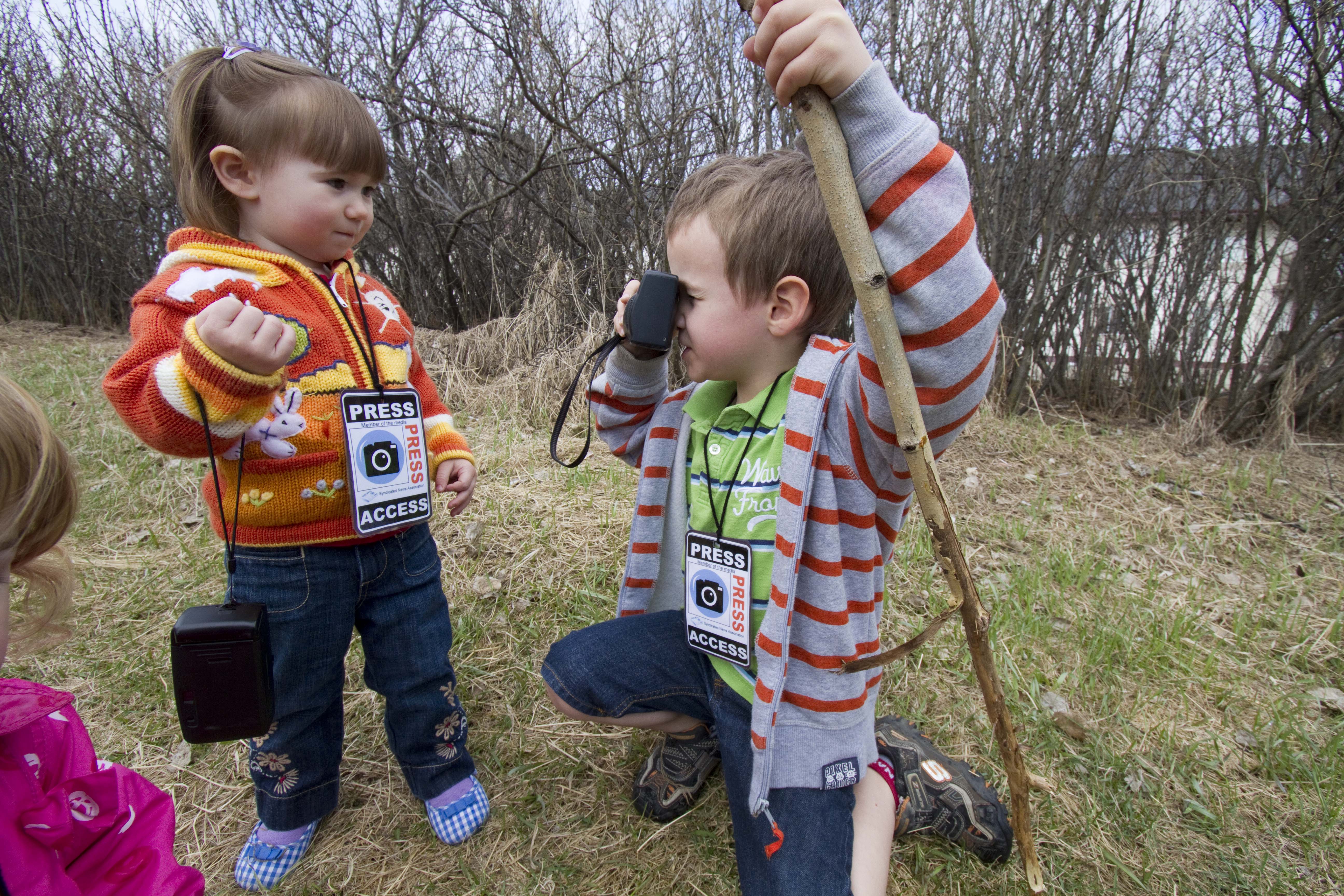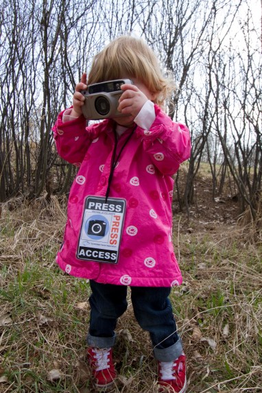 Today our little ones dipped into the Shutterbug Box and headed out for their first walk as photojournalists. They each grabbed a camera and an access pass, shoes and a jacket. Their mission:  to make photographs of all the things they saw in the world around them. Oh, the excitement! It was an unexpectedly fine day and they couldn’t wait! We loaded up the wagon.