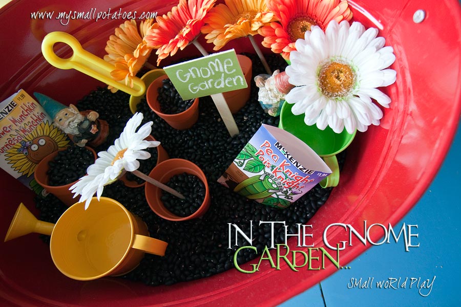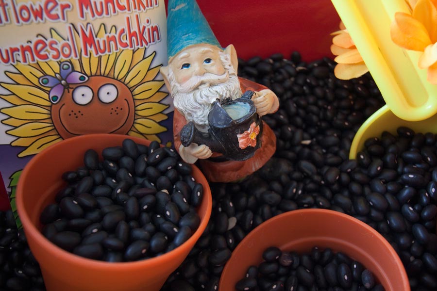 Anyhow, we filled the tub with black beans for the “dirt”. I wanted it to look like soil, but be clean enough to have indoors. Then I cut the long stems off of the silk daisies so the children could “plant” them. I found the little tin watering cans at Jysks also. They were only $4.50 for 3 of them. I tossed in a shovel from our sandbox and a few empty seed packets.