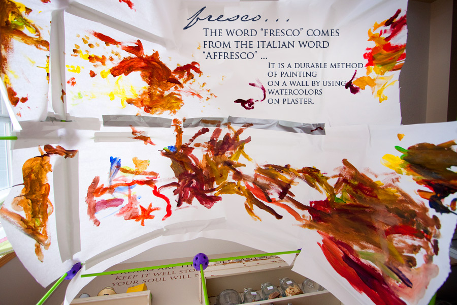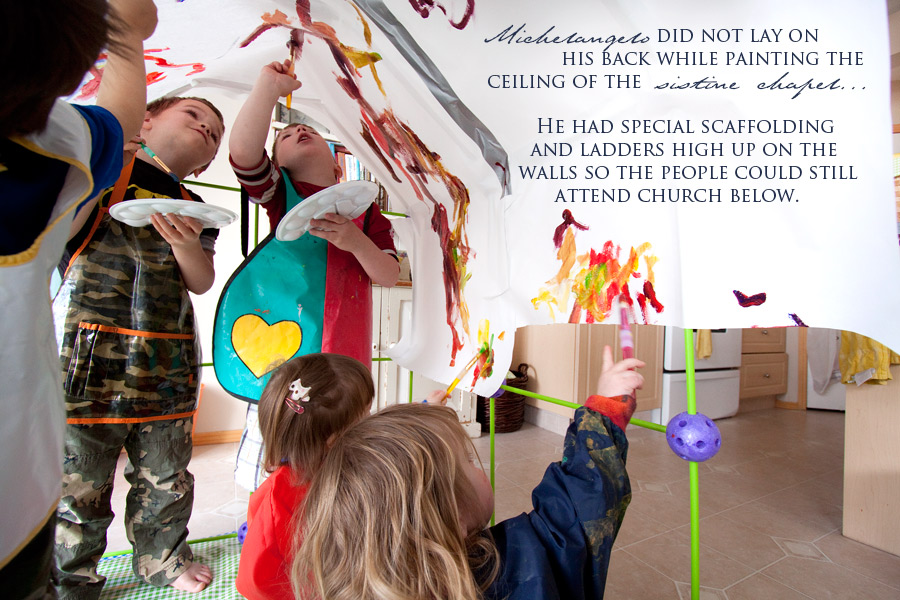 And so we learned about the great Michelangelo. We went on the computer and we looked up all the questions the smalls had and found all the answers. Did he do it by himself? How big was the ceiling? How long did it take him? How did he reach so high? What did he paint on the ceiling, anyways? What’s a fresco? Wait, isn’t that a soda pop? No darlin’, that’s a Fresca!