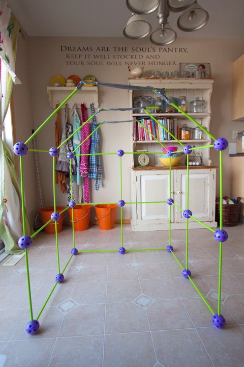 I used our Crazy Fort Kit to build the frame. Then I covered the ceilings with white paper, using the oh, so glamorous duct tape.