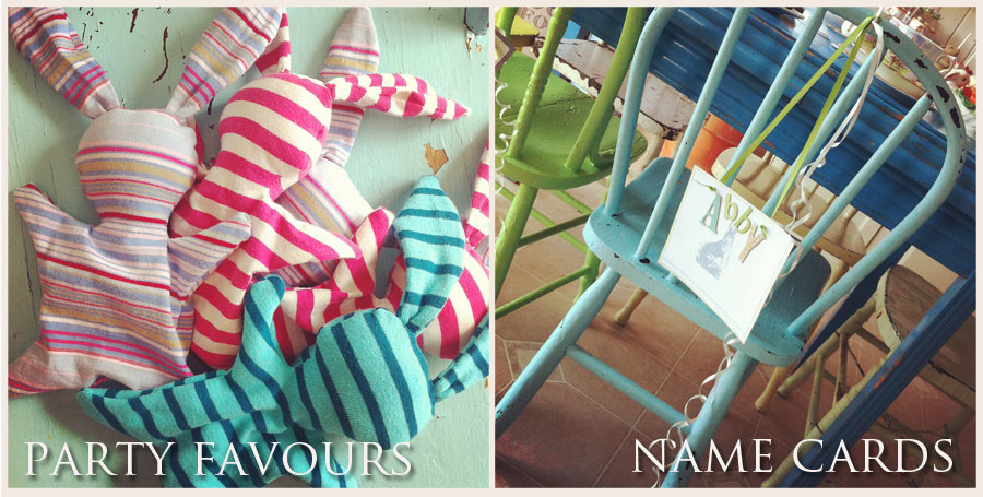 I didn’t want to clutter the table with place cards, so I hung them with ribbon on the backs of their chairs. The party favours were part of the birthday activities. They got to make their own little rabbits. I had prepped the little t-shirt bunnies beforehand, so all the girls needed to do was stuff the bodies and I could sew up the bottoms.
