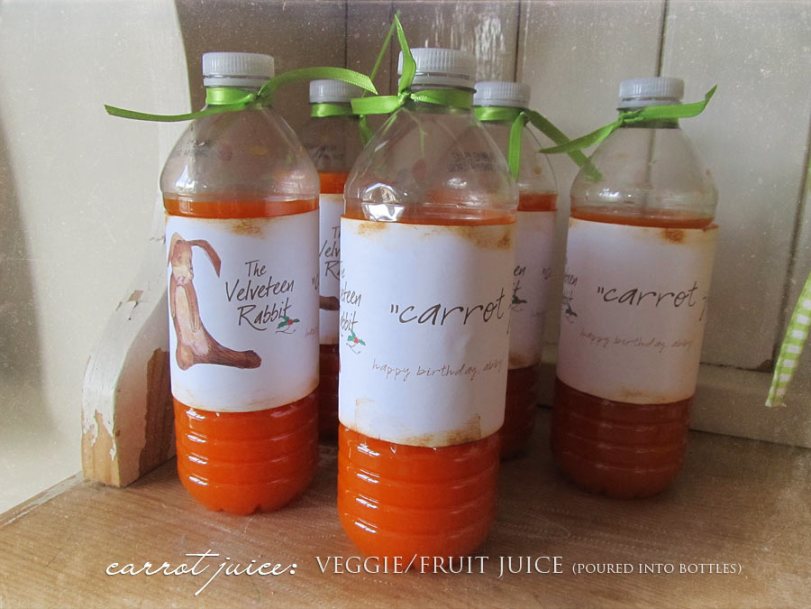 For the juice bottles, I googled a Velveteen Rabbit image and ported it into Pages on my Mac. Then I added text, printed them, cut them, aged them with brown ink, and “glue-sticked” them to the bottles…