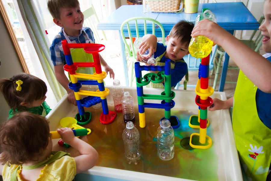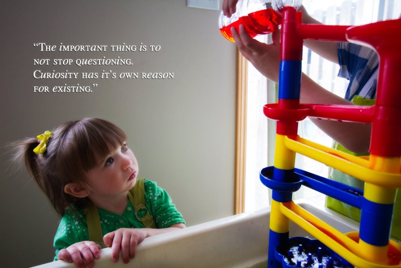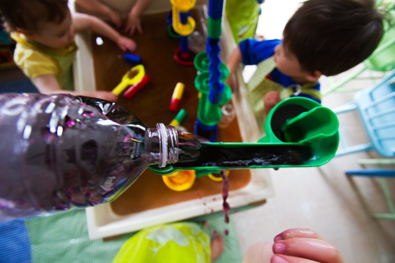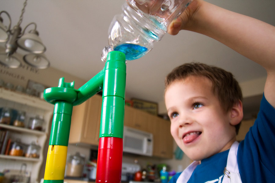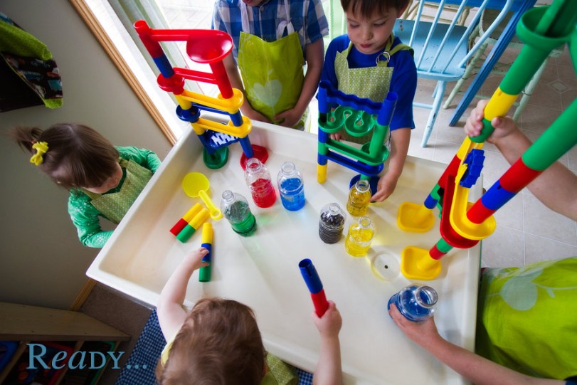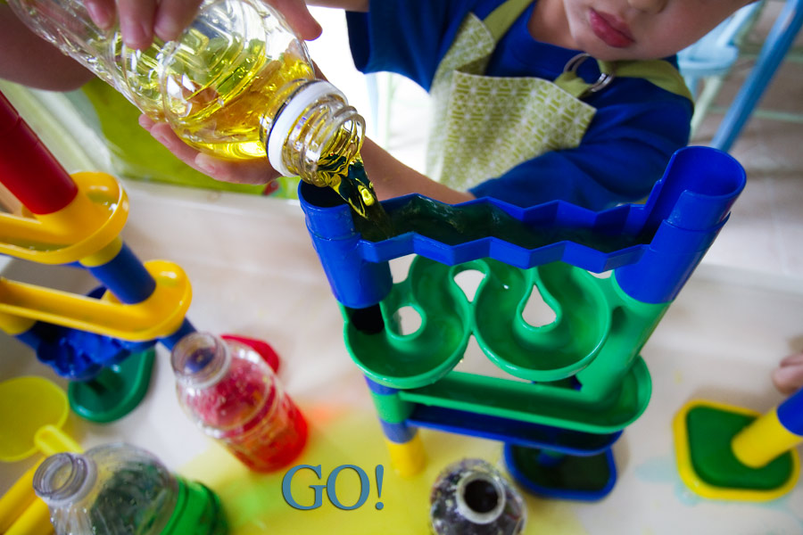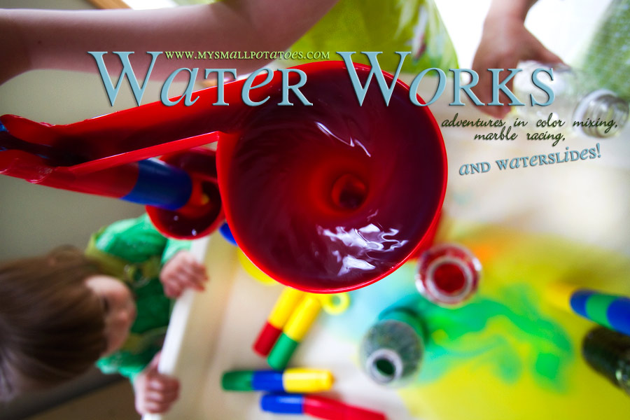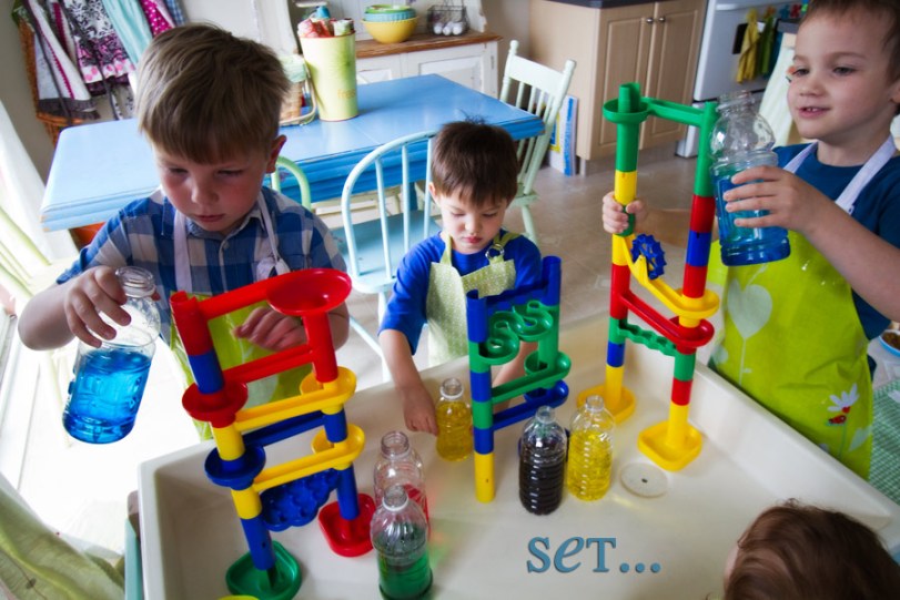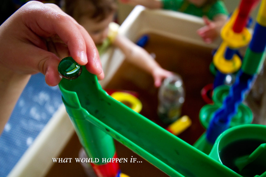 Today we are re-purposing yet another neglected toy. The marble run. It doesn’t seem to get a whole lot of action lately so I thought I’d give it a little boost. Little did I know that the kids would enjoy this activity as much as they did. The word “epic” was thrown about a time or two. And all I did was add water.