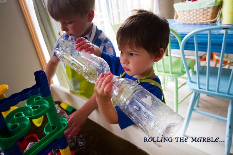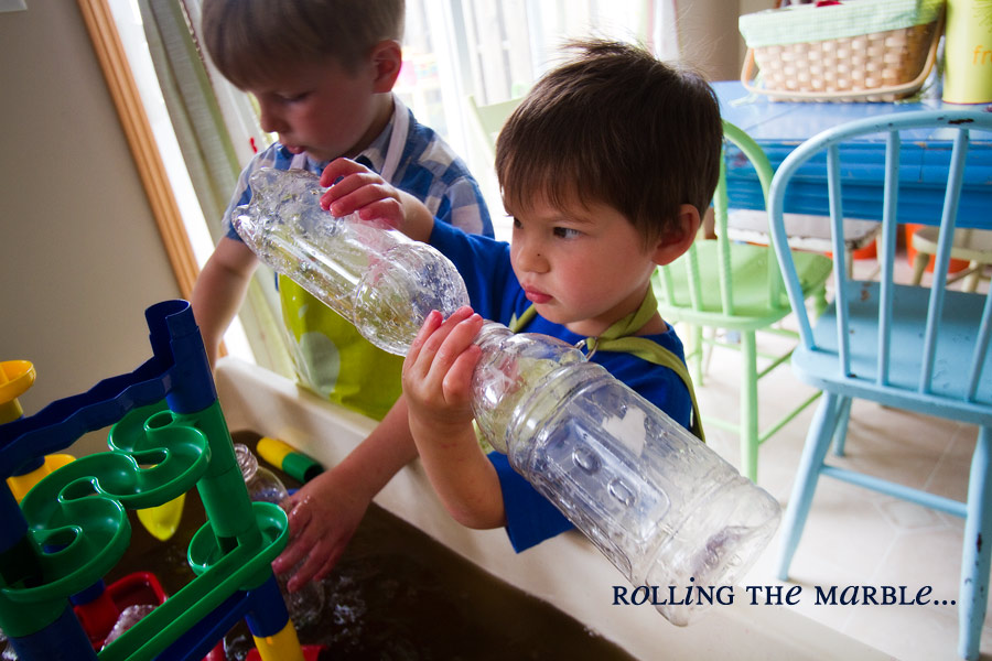 They tried all sorts of different ways to play. The littlest boy even designed his own marble roller with two bottles…
