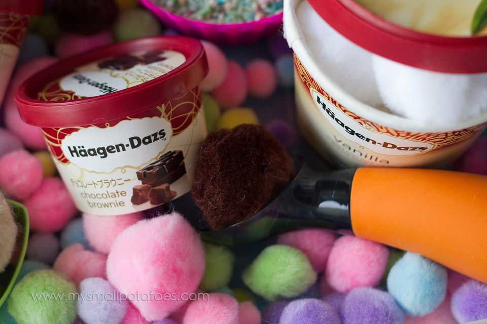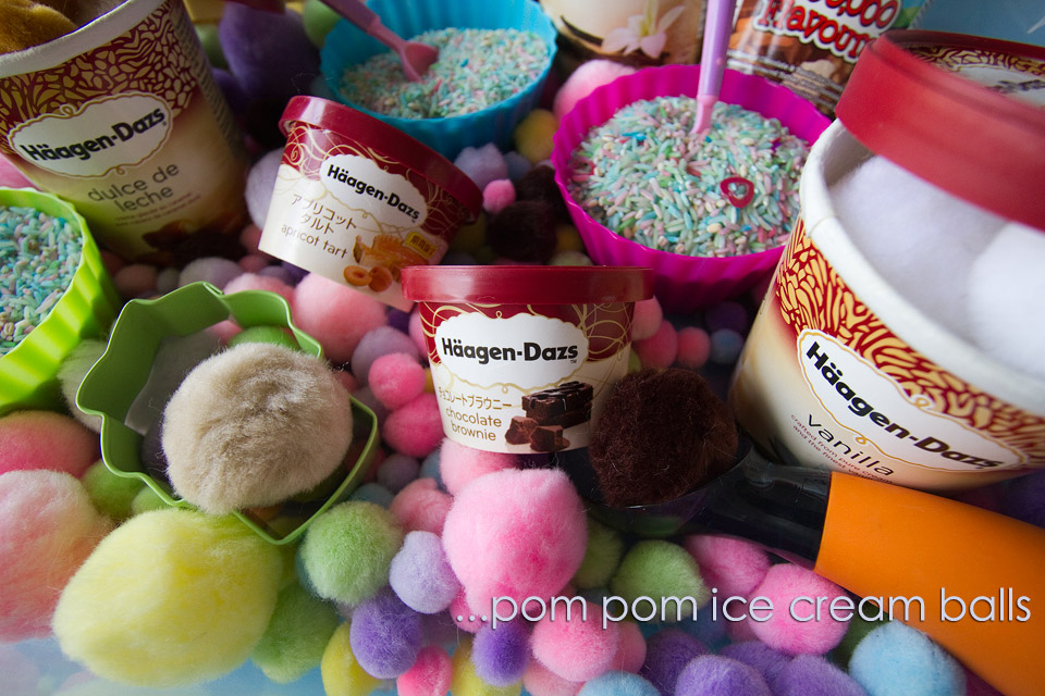 I presented it to the smalls with the tubs filled with pom poms that matched the flavour of the ice cream. This sparked their imaginations to start creating their own flavours of ice cream in the empty tubs. My favourite combination was put together by one of the boys…strawberry lemonade!! I think we will need to make some popsicles in that flavour in the near future!