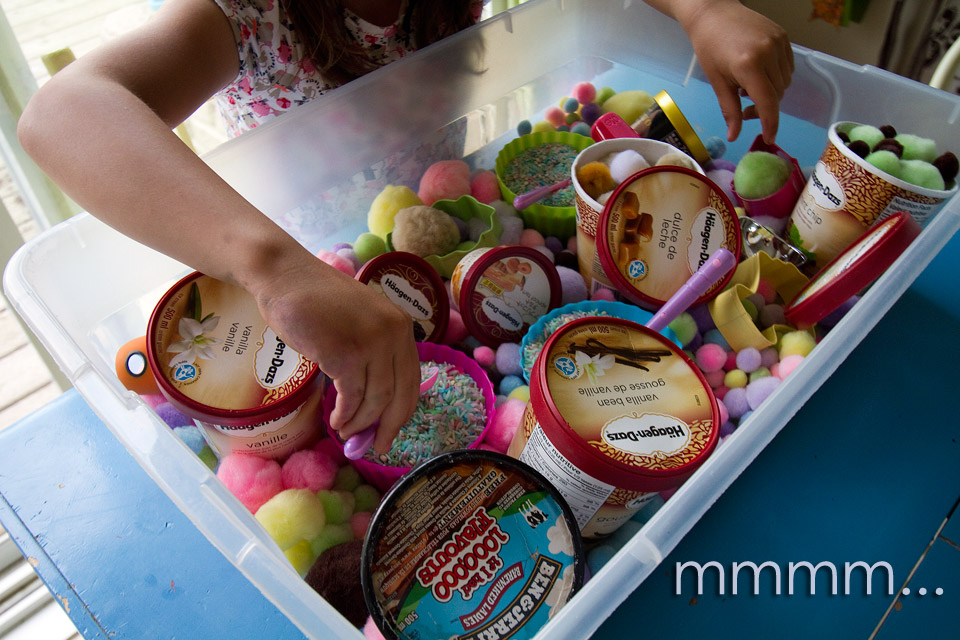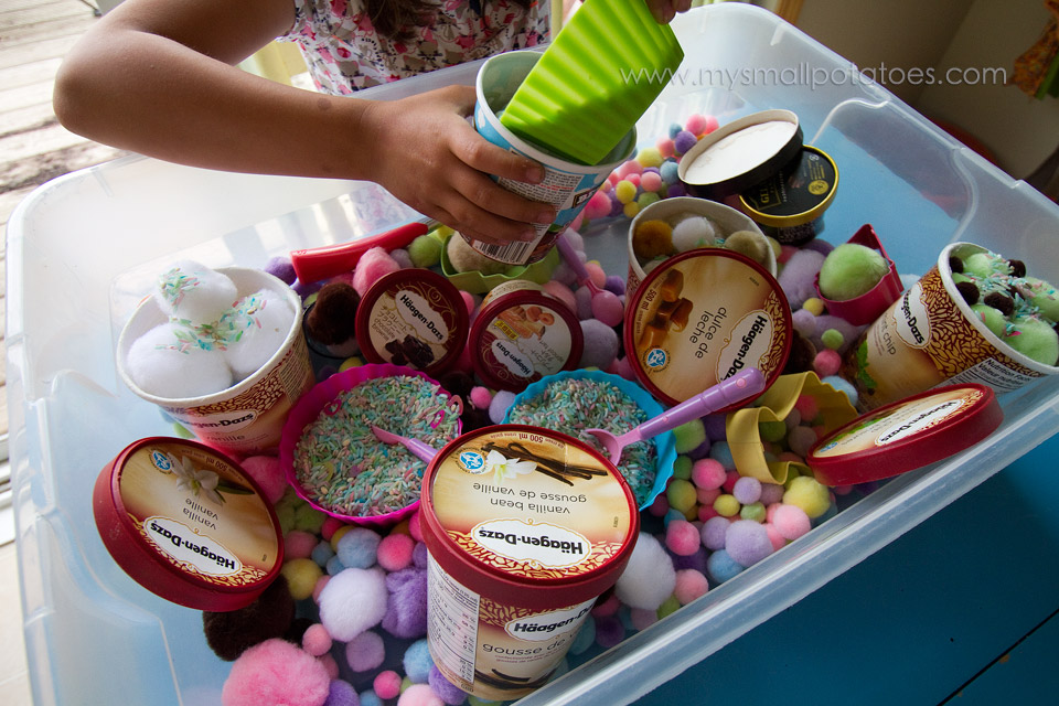 The smalls are still enjoying this bin every day, AND asking to go find the ice cream truck again…everyday!  I think I’ve created some little ice cream monsters!! Maybe we need to do a veggie post soon?!