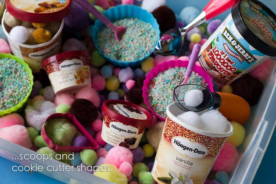 So when we got home from the ice cream adventure, we put together our very own ice cream play bin with things we had in the craft cupboard…