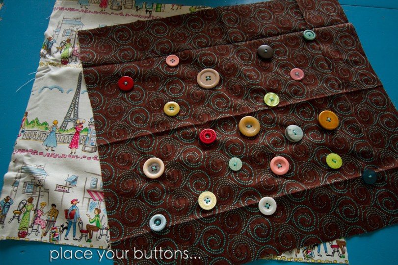Once you’ve got your fabric cut, start placing your buttons (which I found in junk sales, my scrapbook stash, and dollar stores). There does not need to be any rhyme or reason to button placement.