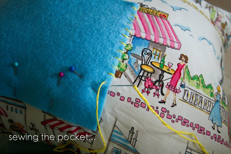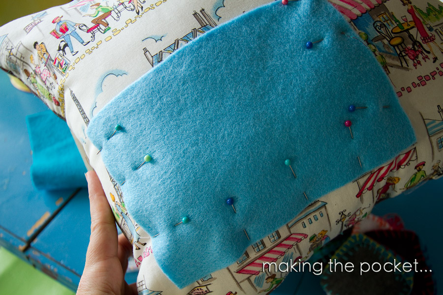 The blanket stitching on the top edge of the pocket was an afterthought for me. It would have been waaaay easier to do BEFORE sewing the pocket to the pillow!