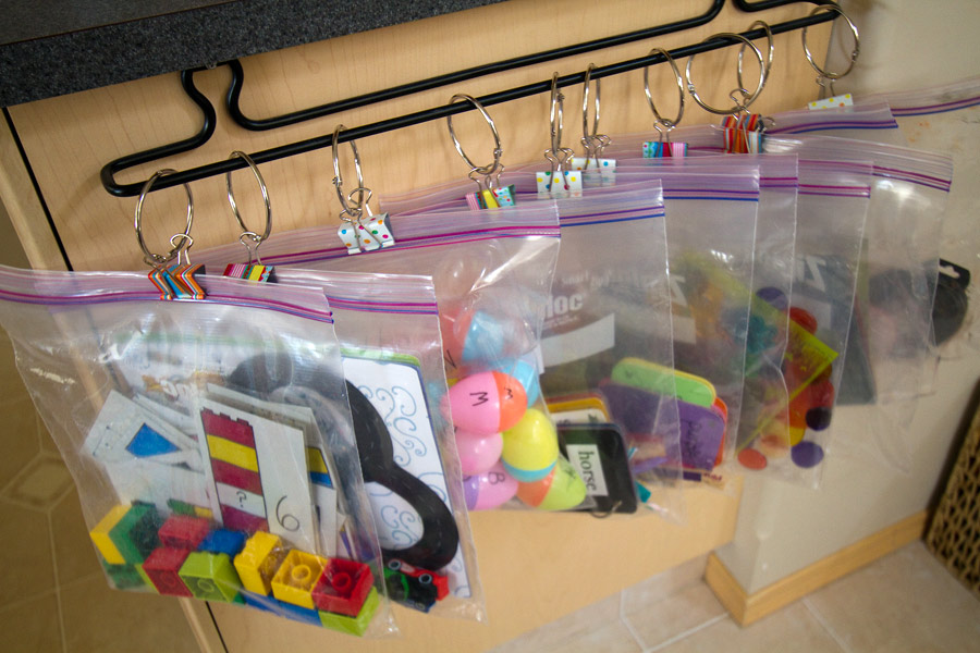 We also have many other bags that I have put together with store-bought items. For example, one bag is full of window-clings that kids can stick on and off my patio window, dishwasher front, or refrigerator door. Another one has ink pads and stamps and little squares of paper. You can put just about any activity into a bag and call it a busy bag…as long as it fits in the bag!!