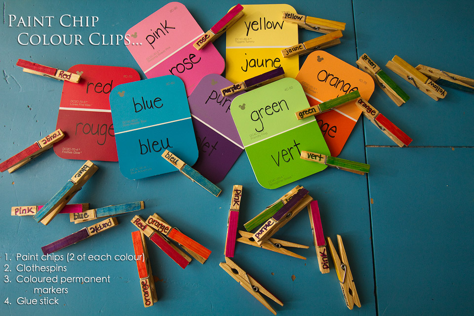 I glued 2 paint chip cards together so they are double-sided AND sturdier. Clothespins have the english word and the french word and children clip them to the corresponding paint chip. I warn you now…this is not a good activity for toddlers. They will pull your clothespins in two. This I promise you! Lol!