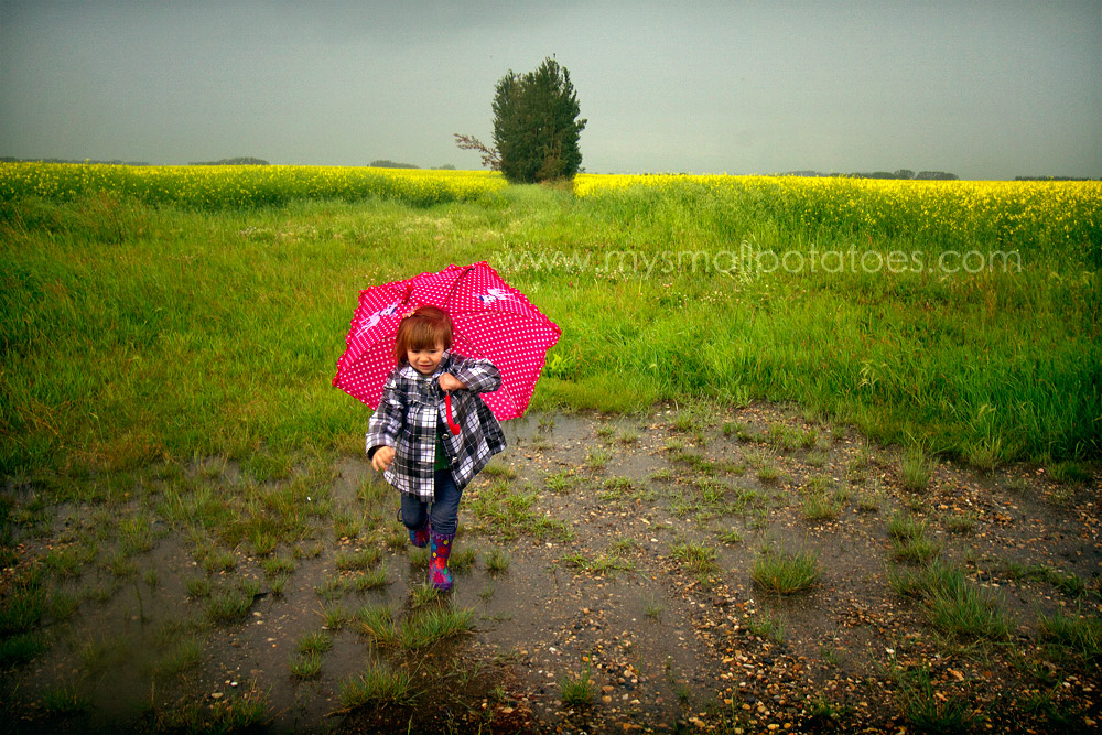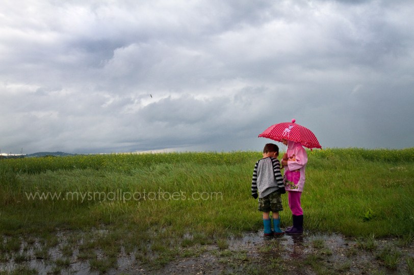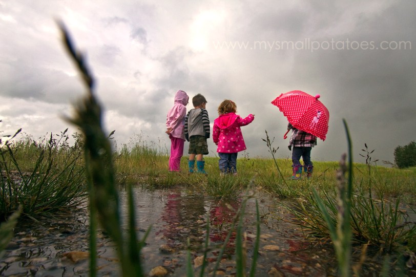 No one ever got anywhere by being afraid, is my philosophy. So when I had a couple of smalls afraid of the thunderstorm today…well…I took them out to play in it!