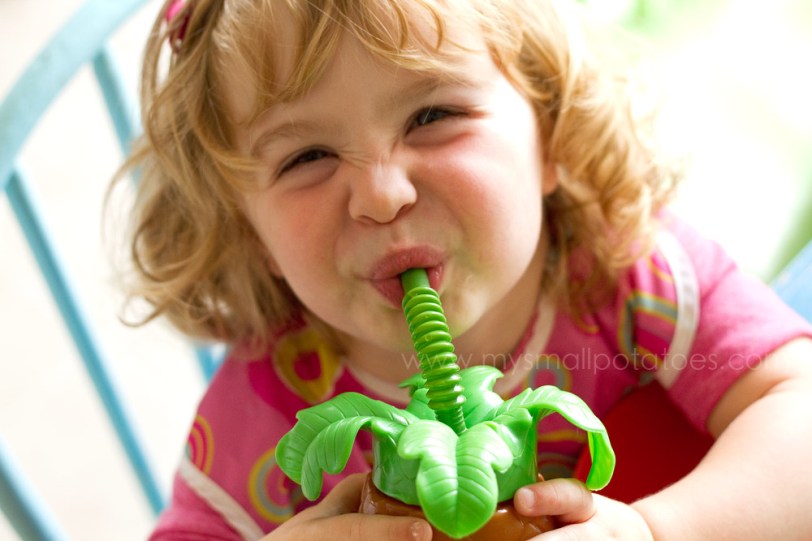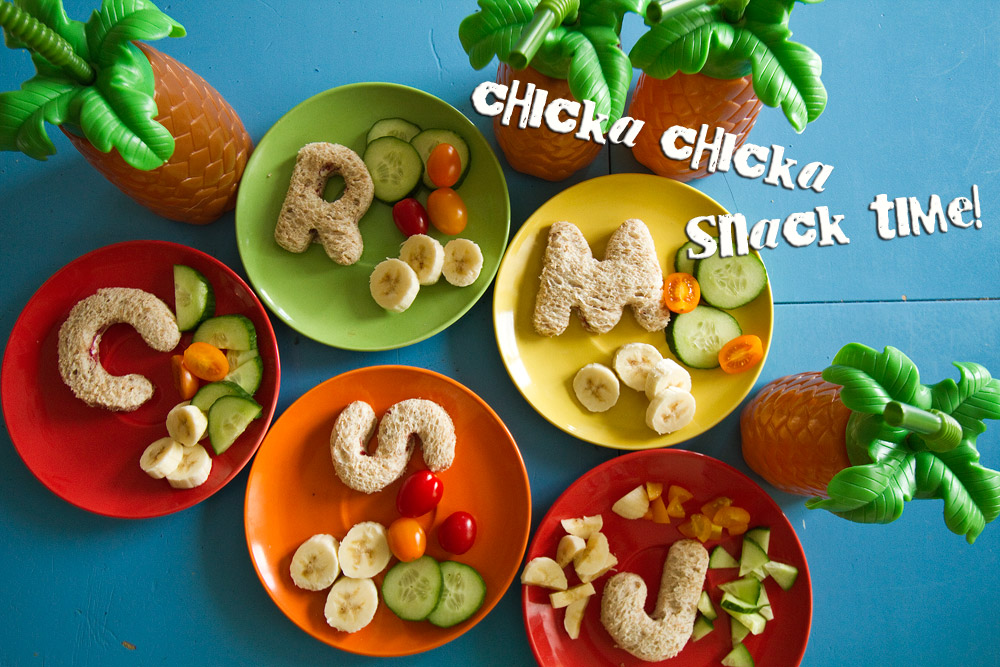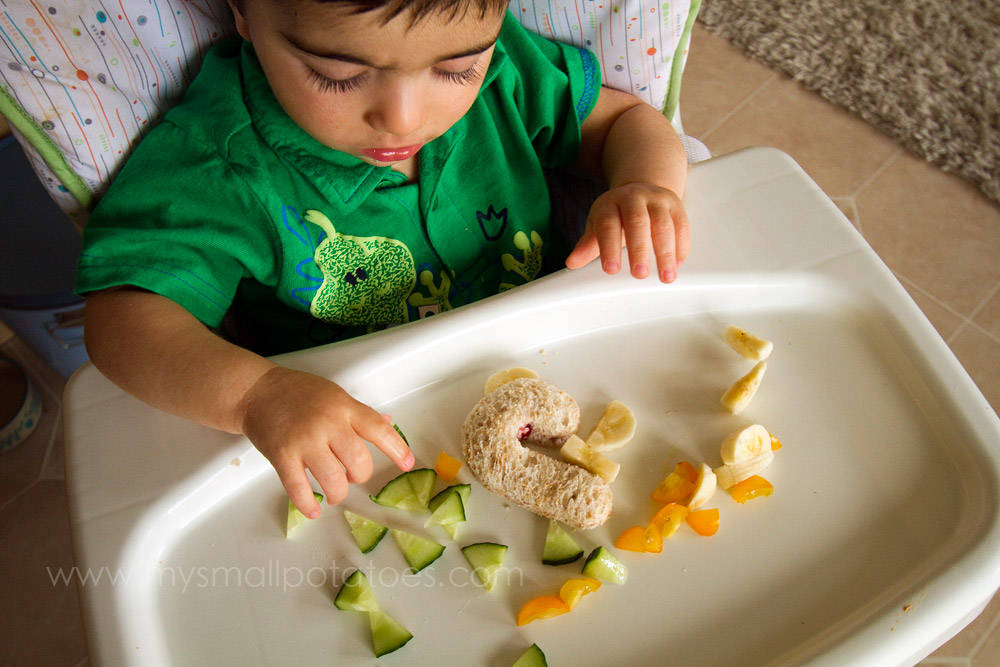 Little cream cheese and jam sandwiches cut in the first letter of each of their names,with colourful veggies to go alongside. We fetched the cups out of the sensory table, filled them up, and popped their straws in!